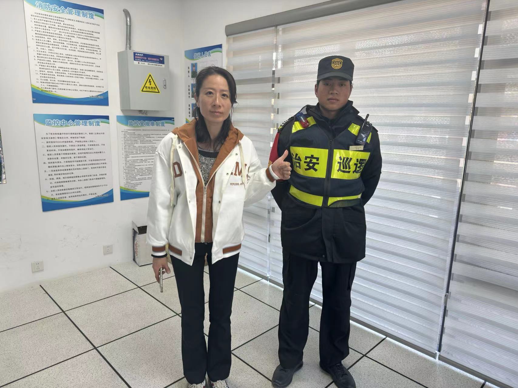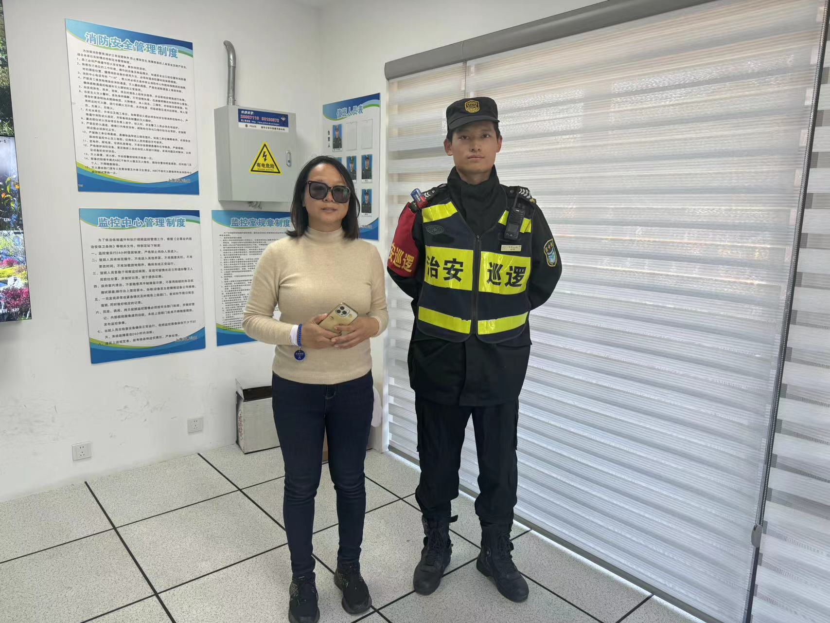 11月19日13:15,宗保公司駐浦東新區(qū)沔青公園項目員工周會達在兒童樂園路口巡查時,撿到一部蘋果14手機,隨即將情況報告了帶隊隊長,并按指示將手機送到監(jiān)控室。大概過了20多分鐘,一位女士打電話過來尋找手機,周會達問清手機的顏色、型號后,與她約好在監(jiān)控室碰面。很快,一位女士趕到監(jiān)控室,周會達核對好手機信息,確認女士是失主后,就將手機交還給了她。