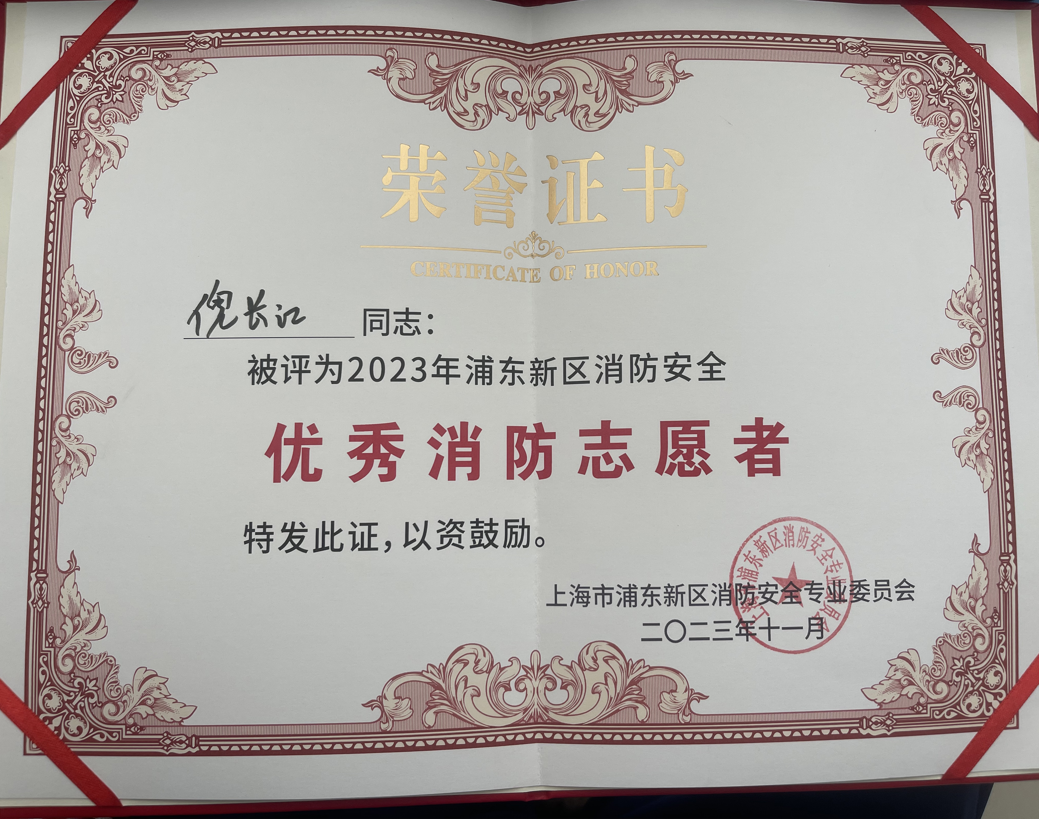 倪長(zhǎng)江堅(jiān)持踐行公司“服務(wù)至上”的經(jīng)營(yíng)發(fā)展理念,遵守消防操作工作規(guī)范,主動(dòng)與消防辦溝通聯(lián)系,密切進(jìn)行協(xié)同配合,努力提高服務(wù)保障質(zhì)效,出色地完成了消防辦賦予的各項(xiàng)工作任務(wù),并因工作出色被上海市浦東新區(qū)消防安全專業(yè)委員會(huì)評(píng)為“2023年浦東新區(qū)消防安全優(yōu)秀消防志愿者”。