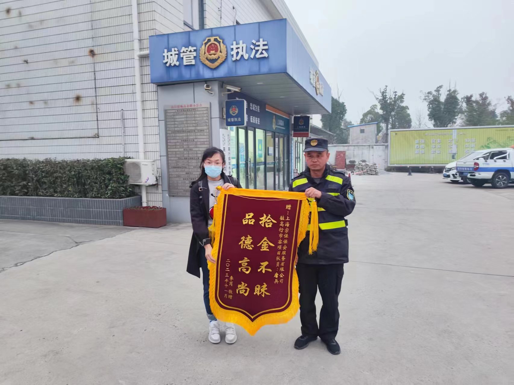 11月24日,市民李女士將一面繡有“拾金不昧 品德高尚”的錦旗贈送給宗保公司駐浦東新區(qū)高行市容項目員工唐兵,感謝他拾金不昧的行為。