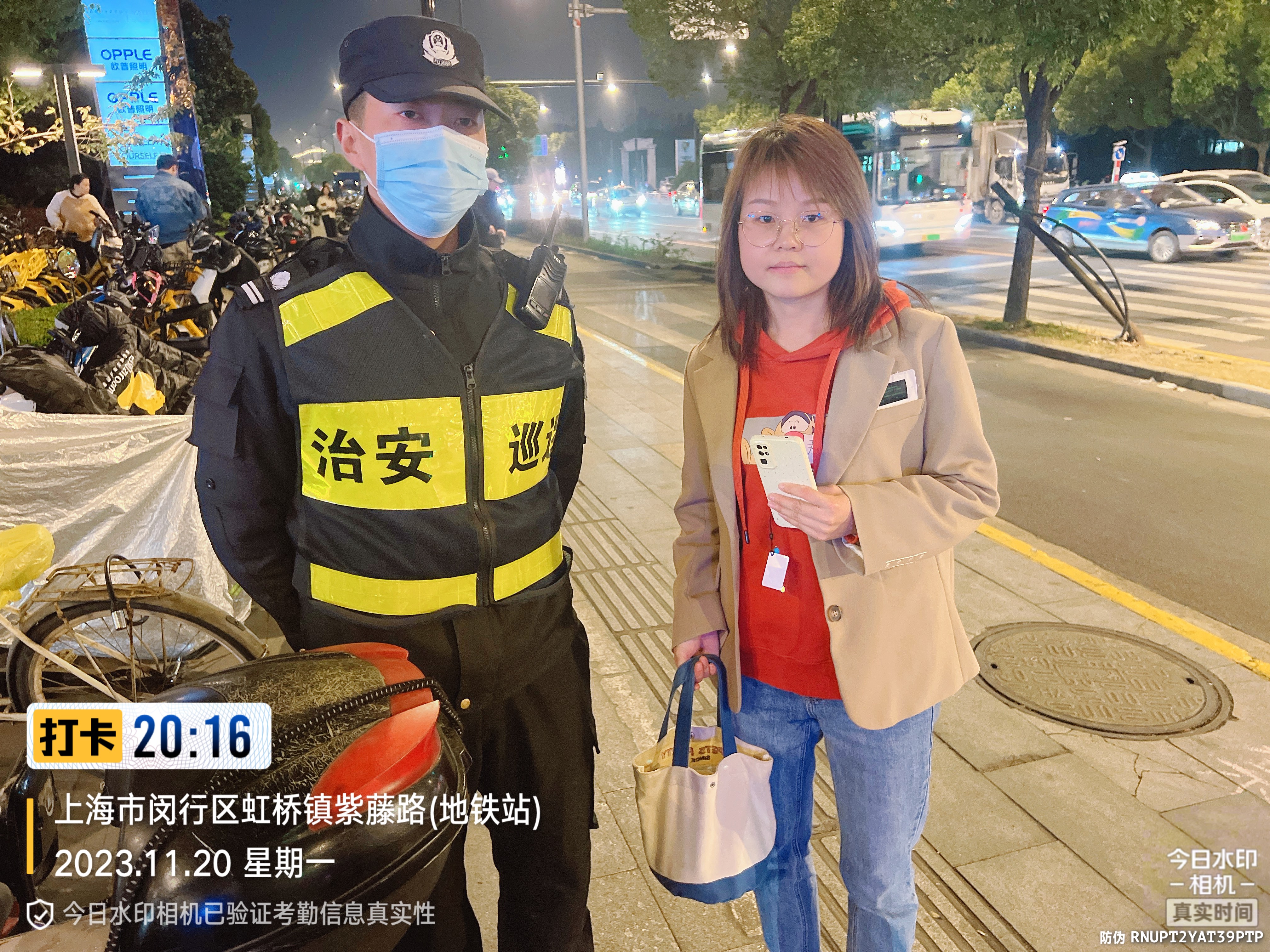 11月20日19:35,宗保公司駐閔行區(qū)虹橋交管輔助項目員工黃志亮在吳中路與虹莘路路口值勤時,撿到一部華為手機(jī),報告帶班組長后便在原地等待。大約過了20分鐘,仍沒有失主來尋找,黃志亮就將手機(jī)交給了前來接班的同事薛峰崗保管。20:16,一位身穿駝色外套的女子趕到現(xiàn)場尋找手機(jī)。薛峰崗詢問女子手機(jī)的品牌、顏色、型號,確認(rèn)與撿到的手機(jī)相符后,便把手機(jī)交還給了她。得知事情原委的女子,再三請薛峰崗代其向黃志亮表示感謝。