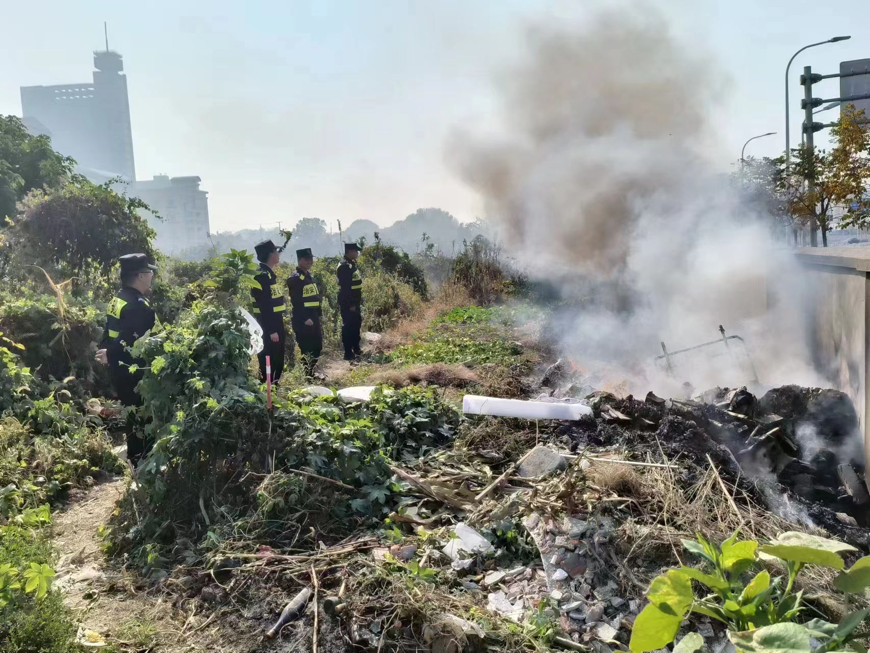 當日10:50,宗保公司員工王夢宇在拱北路與拱亮路交叉口值勤時,發(fā)現(xiàn)前方路邊空地內(nèi)冒著滾滾濃煙,便立刻叫上附近同事前去察看,原來是路邊院墻內(nèi)側堆放的廢棄建材起火。