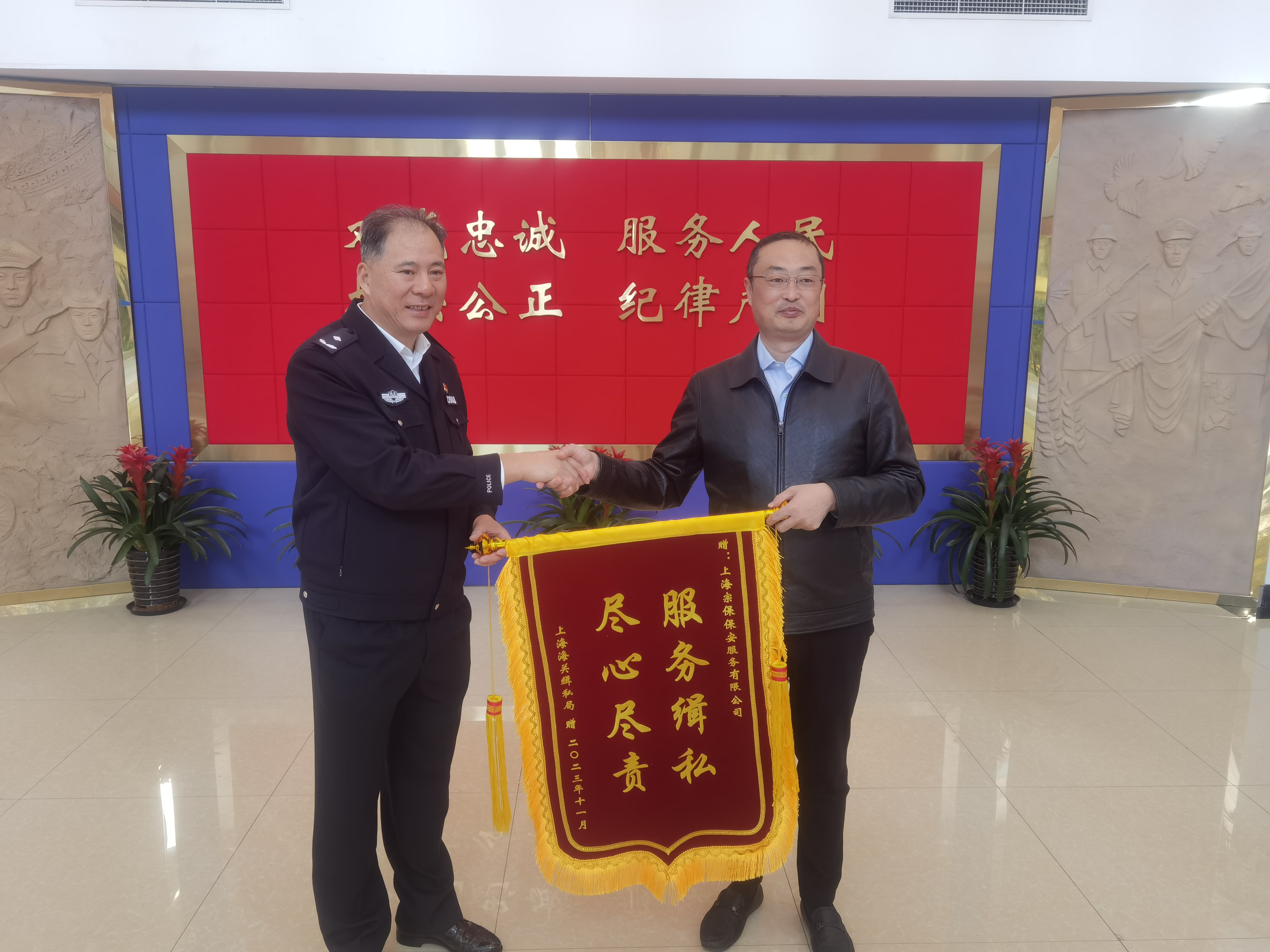 11月29日,上海海關(guān)緝私局辦公室主任李培錦將一面繡有“服務(wù)緝私 盡心盡責(zé)”的錦旗贈(zèng)送給宗保公司總經(jīng)理蔣德玉,感謝公司對(duì)緝私局工作的大力支持和配合。