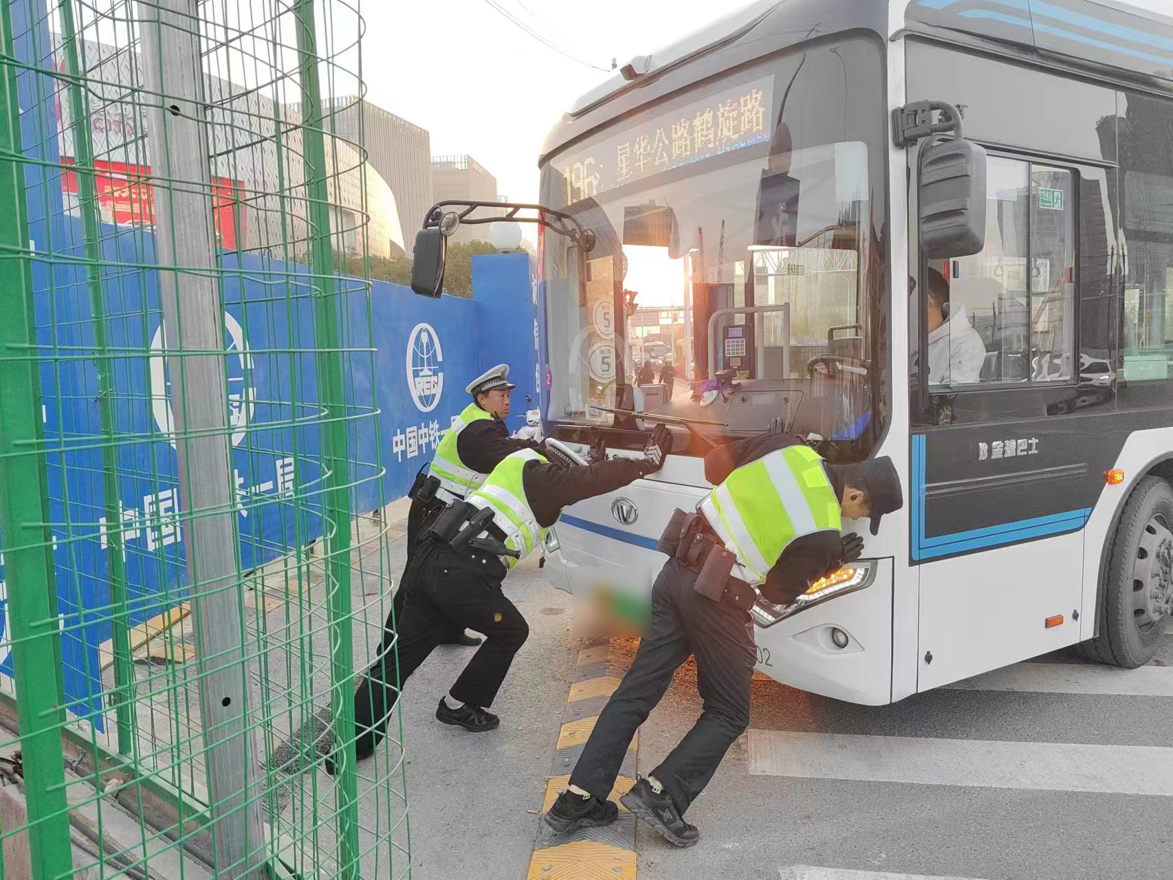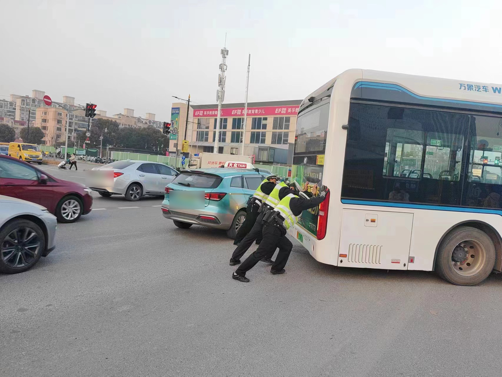 兩人見狀上前詢問,原來公交車發(fā)生故障無法啟動(dòng)??紤]到公交車停在馬路中間,不但影響其他車輛的正常通行,還存在一定的安全隱患,于是兩人與公交車駕駛員商量后,就立即呼叫附近崗位同事前來幫忙推車。