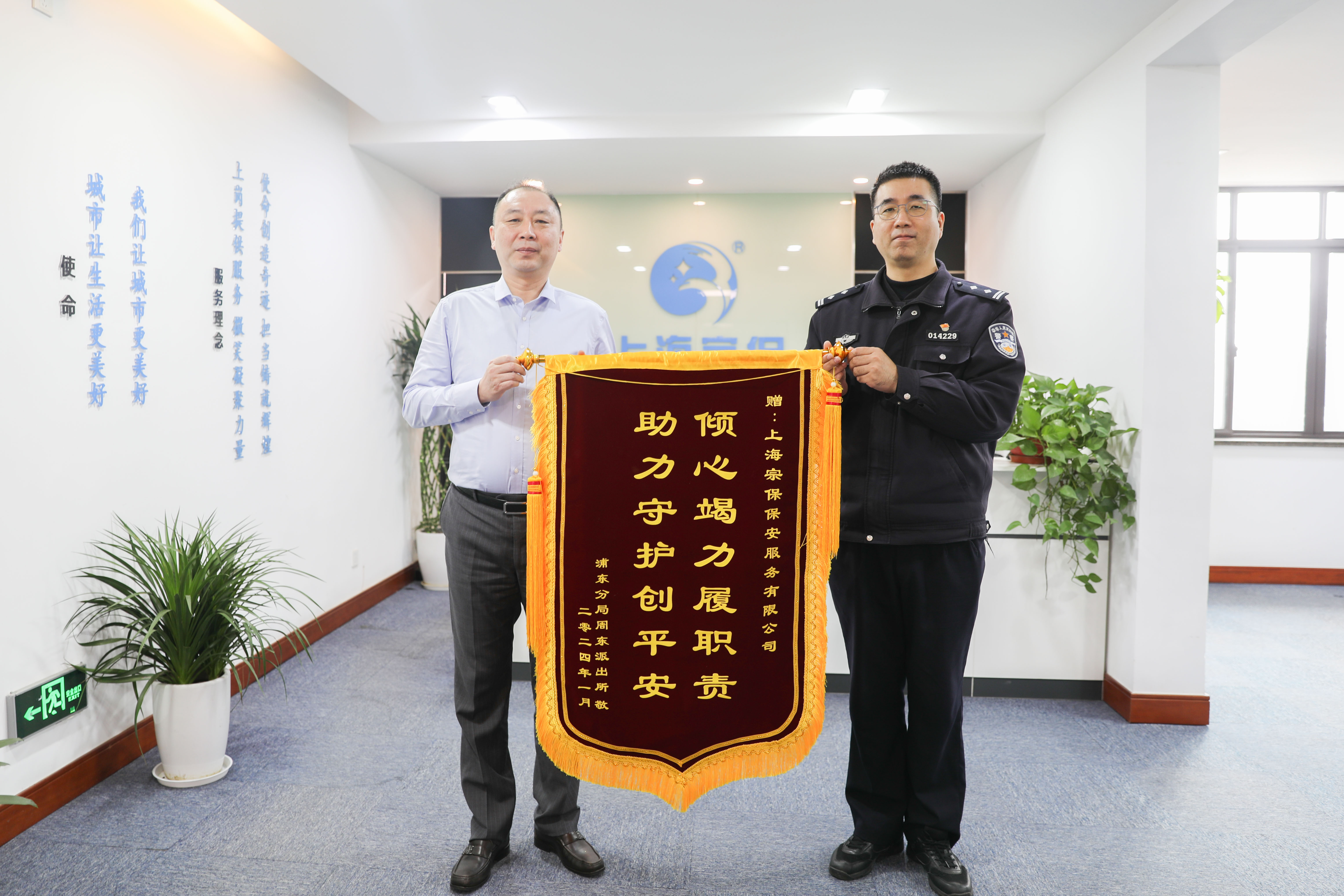 1月16日,浦東新區(qū)公安分局周東派出所將一面繡有“傾心竭力履職責(zé) 助力守護(hù)創(chuàng)平安”的錦旗贈送給宗保公司董事長王耀,感謝公司對周東派出所工作的大力支持和積極配合,贊揚(yáng)公司員工履職盡責(zé)、助力平安建設(shè)的出色表現(xiàn)。