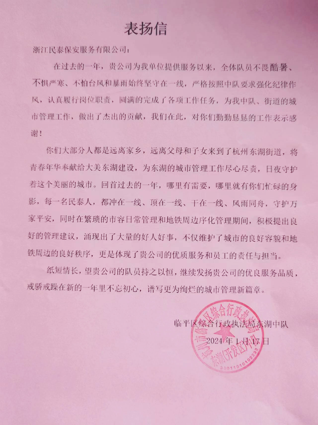浙江民泰公司收到杭州市臨平區(qū)綜合行政執(zhí)法局東湖中隊(duì)的表揚(yáng)信