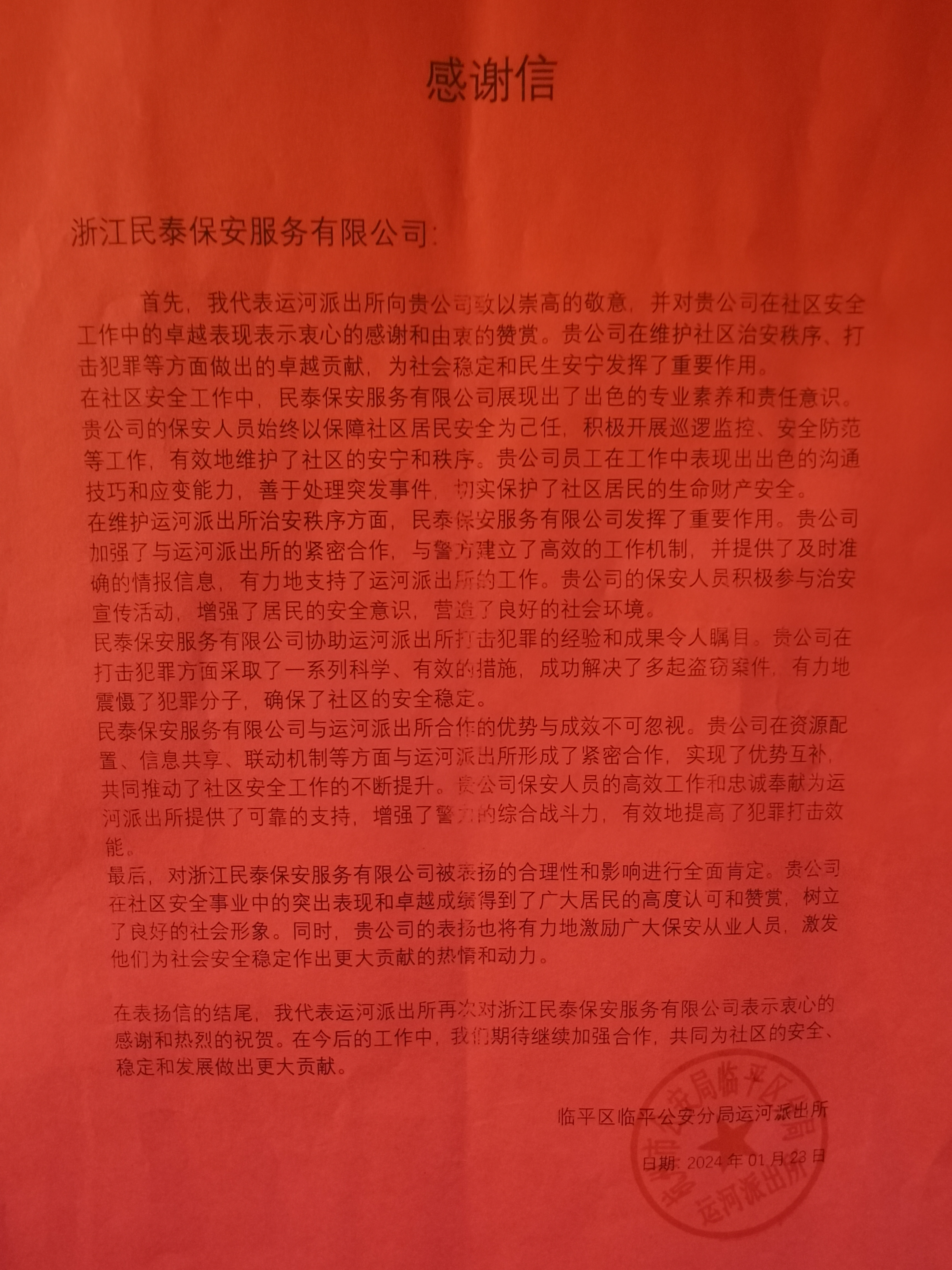 1月23日,浙江民泰公司收到杭州市公安局臨平區(qū)分局運(yùn)河派出所的感謝信,感謝公司在協(xié)助派出所維護(hù)轄區(qū)秩序、處置突發(fā)事件、開展法治宣傳等工作中作出的貢獻(xiàn),贊揚(yáng)了公司建立警保聯(lián)動機(jī)制、保持高效密切協(xié)同,全力配合派出所打造平安社區(qū)的出色表現(xiàn)。