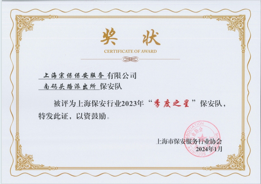 近日,上海市保安服務(wù)行業(yè)協(xié)會公布了2023年“年度之星”和第四季度“季度之星”評選結(jié)果,上海宗保保安服務(wù)有限公司3個保安隊和3名員工分獲殊榮。