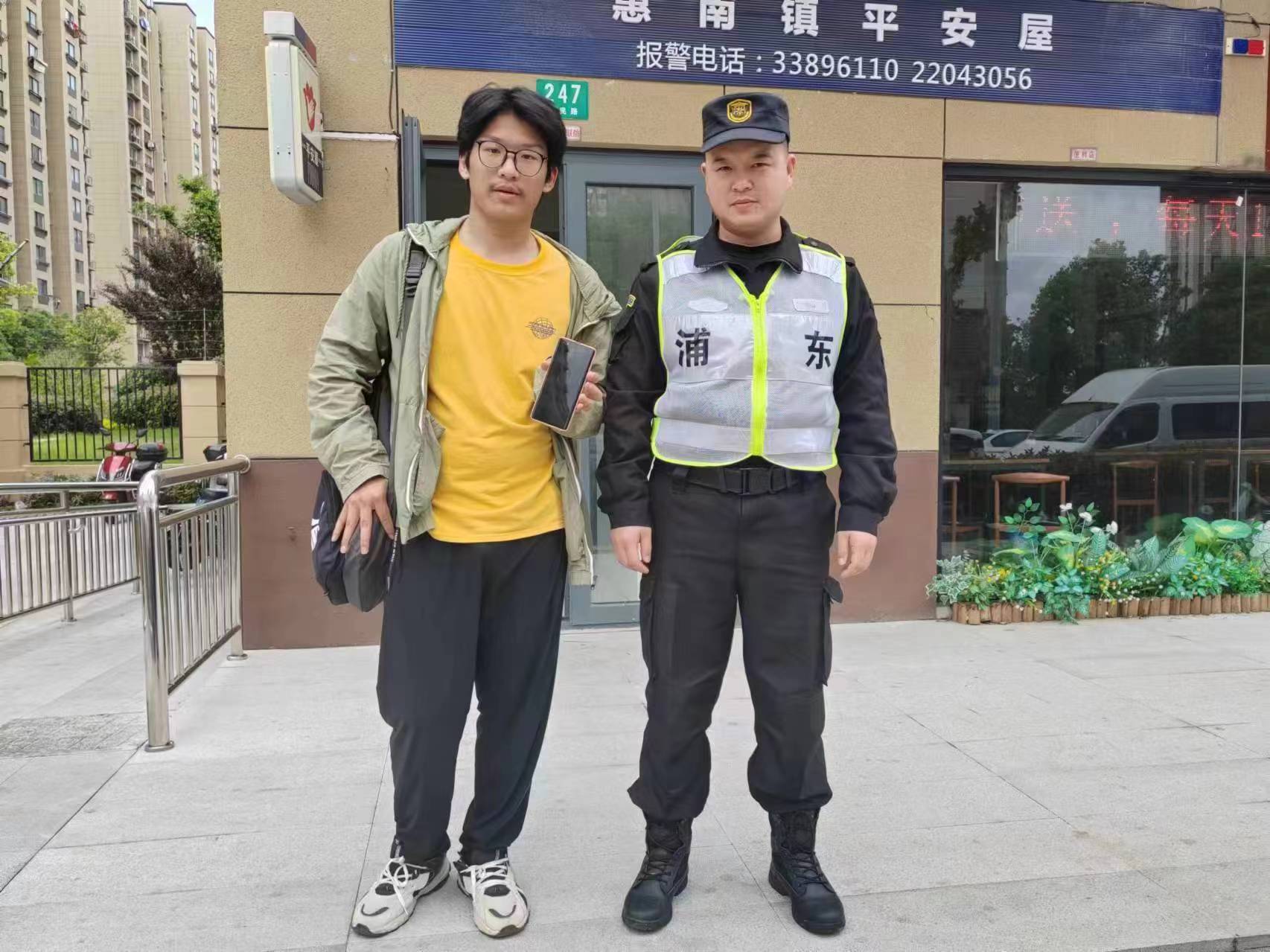 5月2日13:35,宗保公司駐浦東新區(qū)惠南鎮(zhèn)民樂派出所輔助項(xiàng)目員工徐公源和吳志超在聽達(dá)路拱優(yōu)路西側(cè)巡邏時(shí),撿到一部vivo手機(jī),報(bào)告組長(zhǎng)后便在原地邊執(zhí)勤邊等待失主。大概過了十幾分鐘,一位自稱是失主的男子打來電話,徐公源了解情況后便與他約好碰面地點(diǎn)。不一會(huì),一位年輕小伙來到約定地點(diǎn)。吳志超核對(duì)確認(rèn)其是失主后,就把手機(jī)交還給了他。小伙拿著手機(jī)非常高興,激動(dòng)地連連向宗保員工致謝。