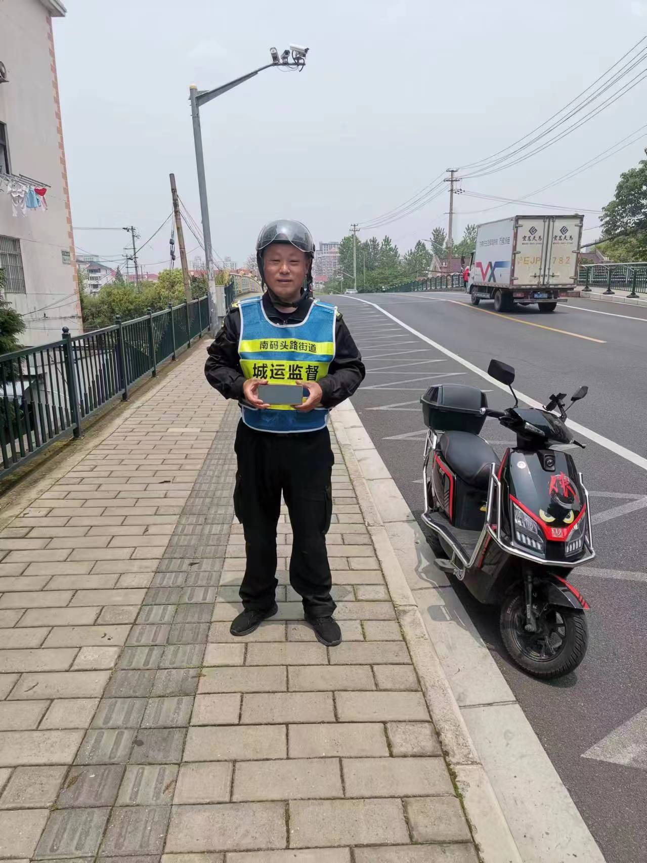 5月7日11:20,宗保公司駐浦東新區(qū)南碼頭城運(yùn)網(wǎng)格項(xiàng)目員工陳安生在浦三路白蓮涇橋附近巡查時(shí),撿到一部黑色華為手機(jī),報(bào)告班組長(zhǎng)后便在原地值勤等待。約過了1個(gè)小時(shí),一位自稱是失主的女士打來電話,語氣顯得十分焦急,通話中一再表明自己是失主。陳安生安慰她不要著急,并與她約好在臨沂新村地鐵口碰面。不一會(huì)兒,一位中年女士急急忙忙趕到現(xiàn)場(chǎng)。陳安生通過女士解鎖手機(jī)鎖屏,確認(rèn)其是失主后,就將手機(jī)交還給了她。手機(jī)失而復(fù)得,女士十分高興要去買香煙表示感謝,被陳安生婉言謝絕了。