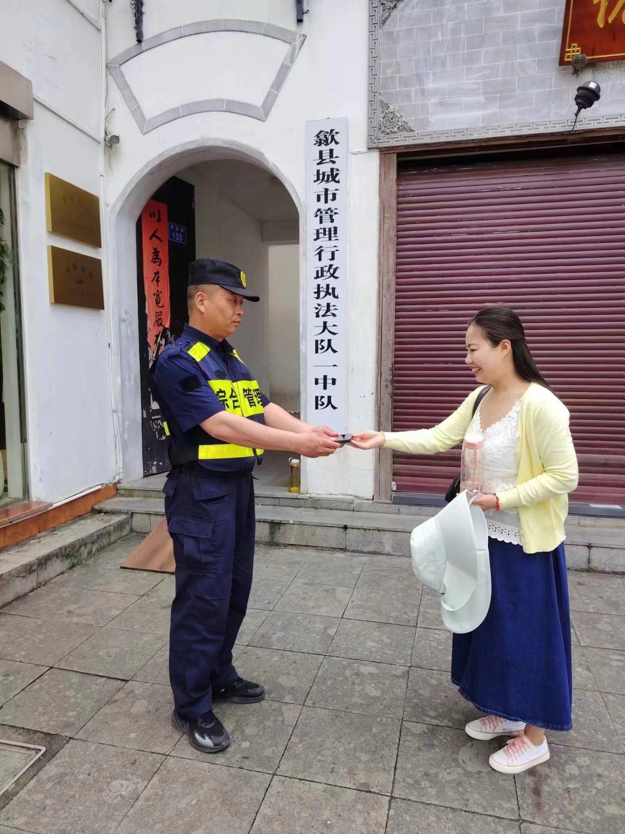 5月9日17:10,宗保公司駐安徽黃山市歙縣市容項(xiàng)目員工趙海文在徽州古城八角牌樓附近巡查時(shí),在打箍井街路口綠化帶的邊上撿到一部蘋果手機(jī),報(bào)告歙縣城市管理行政執(zhí)法局古城中隊(duì)后,便在原地耐心等待。17:30,手機(jī)鈴聲響起,一位自稱是失主的女聲打來電話,說剛剛才發(fā)現(xiàn)手機(jī)丟了。趙海文了解完情況,告知女士領(lǐng)取地點(diǎn)。不一會(huì)兒,一位身穿黃色針織衫的女士趕到現(xiàn)場(chǎng),趙海文確認(rèn)其是失主后,將手機(jī)交還給了她,女士連連道謝。