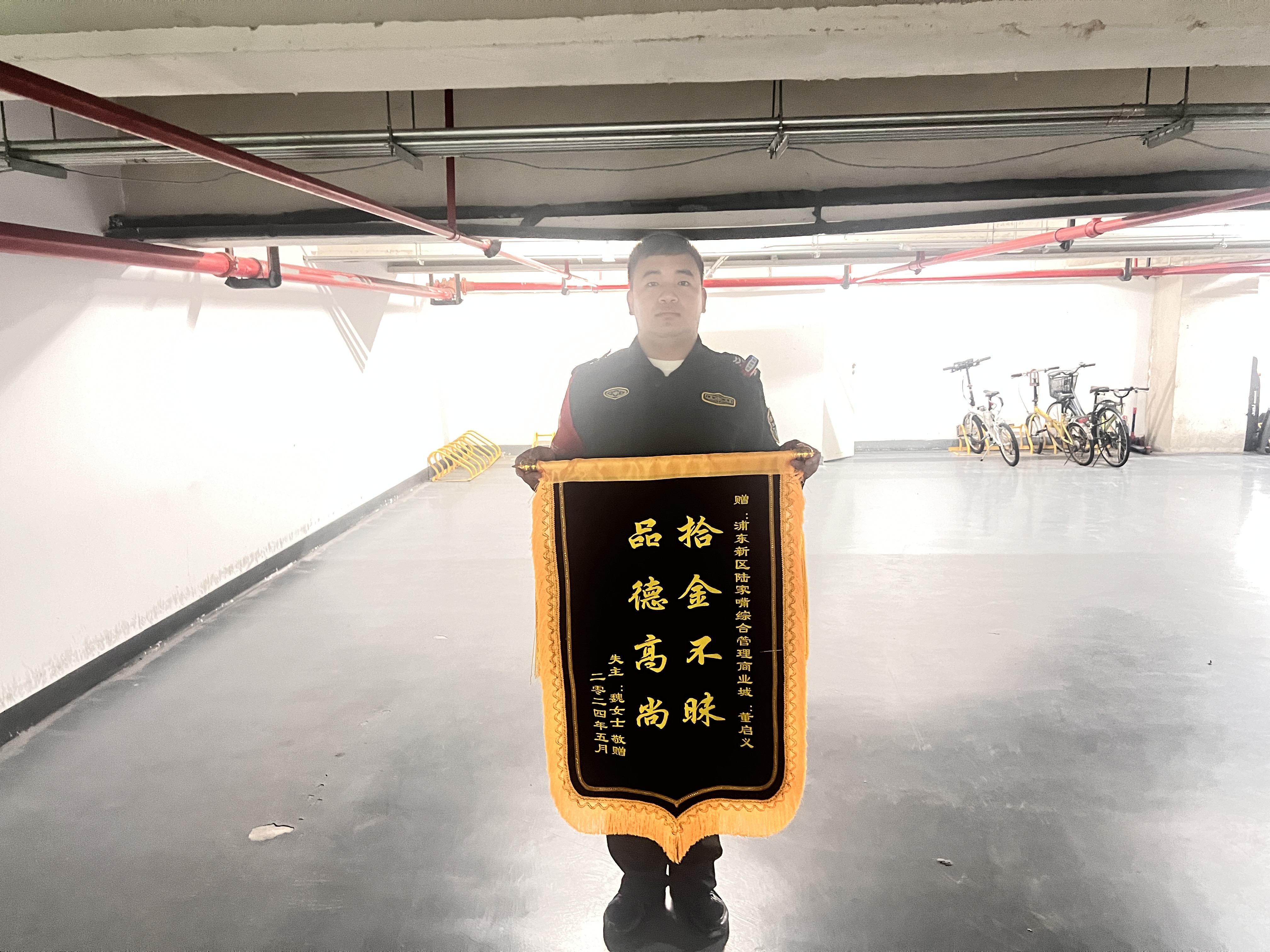 5月11日,宗保公司駐浦東新區(qū)陸家嘴綜合管理項(xiàng)目員工董啟義收到市民魏女士寄來的一面繡有“拾金不昧 品德高尚”的錦旗,贊揚(yáng)他拾金不昧的助人行為。