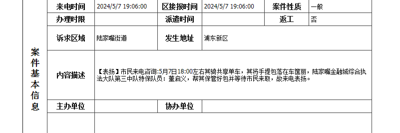 5月7日18:30,公司員工董啟義在地鐵9號(hào)線商城路站2號(hào)口附近巡查時(shí),在一輛共享單車的車筐里發(fā)現(xiàn)一個(gè)手提包,報(bào)告班組長(zhǎng)后便在原地等待。10分鐘后,一女士前來尋找。董啟義通過核對(duì)手提包里身份證等信息,確認(rèn)女士是失主后,就把手提包交還給了她。女士很高興連連道謝,還特意撥打了上海市民服務(wù)熱線12345表揚(yáng)董啟義。