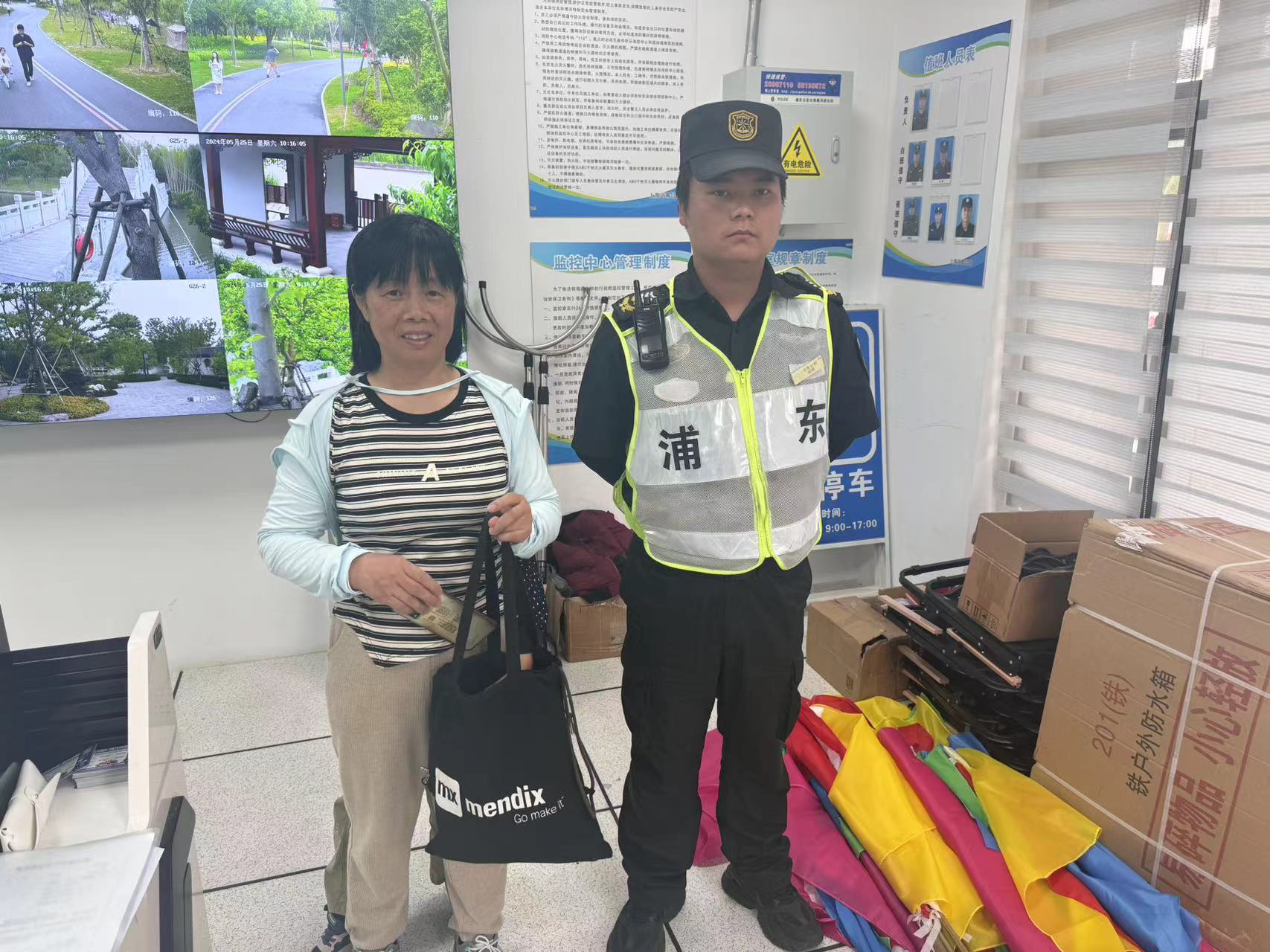 17:00,當(dāng)楊召群再次巡查到楊高南路1998號(hào)時(shí),發(fā)現(xiàn)失主在附近留有尋物啟事,隨即按照啟事上的電話(huà)與失主取得了聯(lián)系,確定對(duì)方是失主后,就讓失主前往南碼頭城運(yùn)中心領(lǐng)取手提包。
