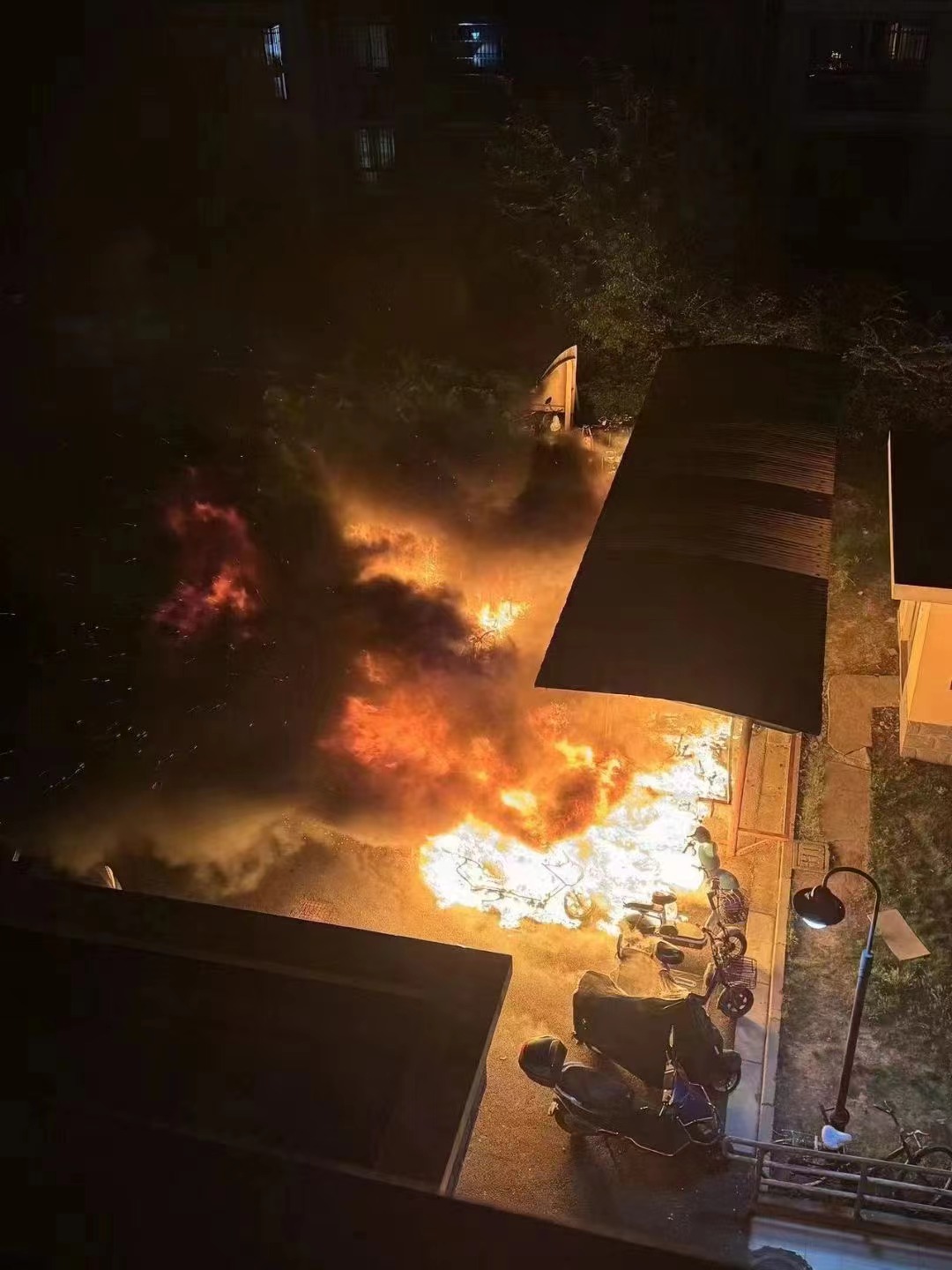 兩人火速趕到現(xiàn)場,發(fā)現(xiàn)車棚內(nèi)多輛電動自行車正在猛烈燃燒,火勢較大濃煙滾滾,同時還夾雜著噼噼啪啪的聲音,更為嚴重的是車棚旁還停放著5輛汽車,火勢如得不到及時有效控制,不但會造成巨大的財產(chǎn)損失,而且還會威脅到小區(qū)居民的生命安全。