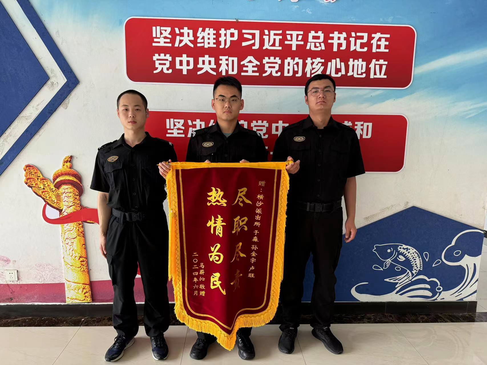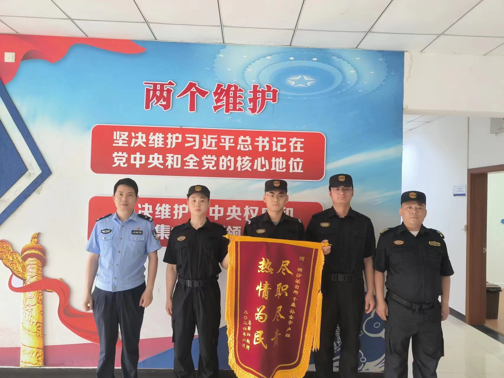 6月21日,宗保公司駐崇明區(qū)公安分局橫沙派出所輔助項(xiàng)目員工收到市民馬女士贈(zèng)送的一面繡有“盡職盡責(zé) 熱情為民”的錦旗,感謝公司員工孫金宇、于淼和盧旺幫她找到了丟失的寵物狗。