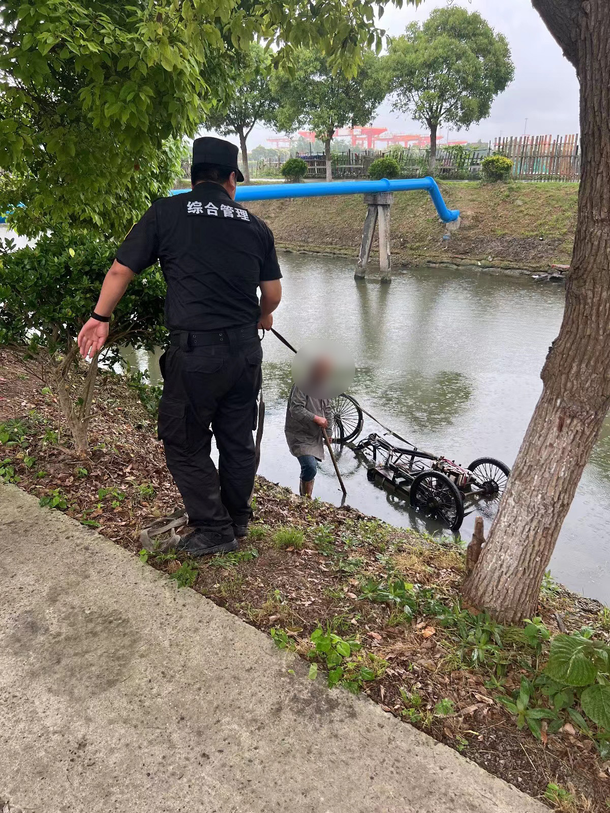 6月19日,宗保公司駐浦東新區(qū)蘆潮港市容項(xiàng)目員工幫助騎三輪車掉入河中老人脫離困境。