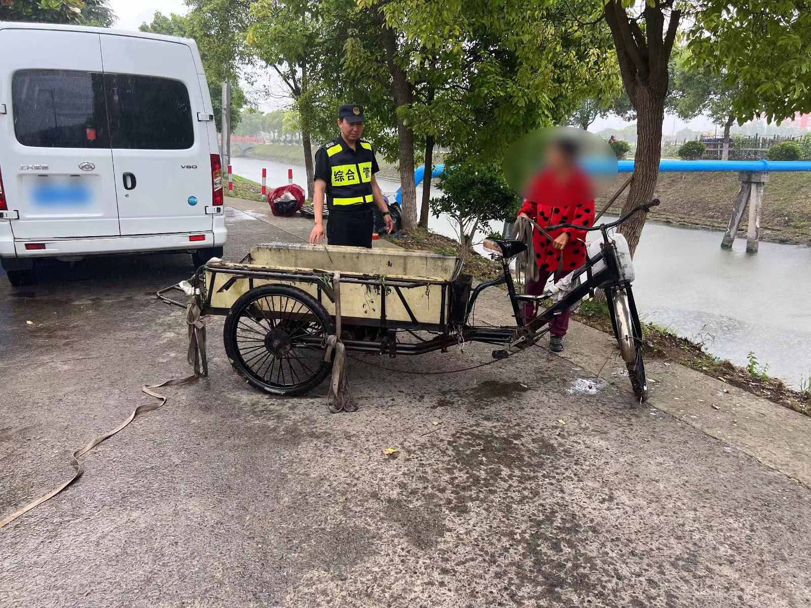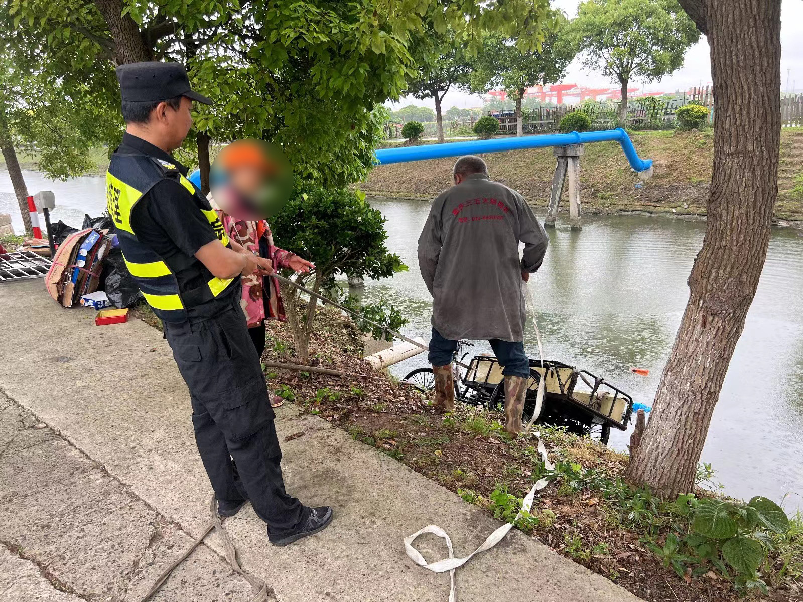 河岸邊,一輛三輪車大部分浸沒在水中。原來,老人騎三輪車行走,因雨天路滑不慎滑到了河里,幸運(yùn)的是老人脫險(xiǎn)爬上了岸。張宇航和康德剛確認(rèn)老人沒有受傷后,就立即取來救援繩索,下河綁好三輪車往岸上拉。