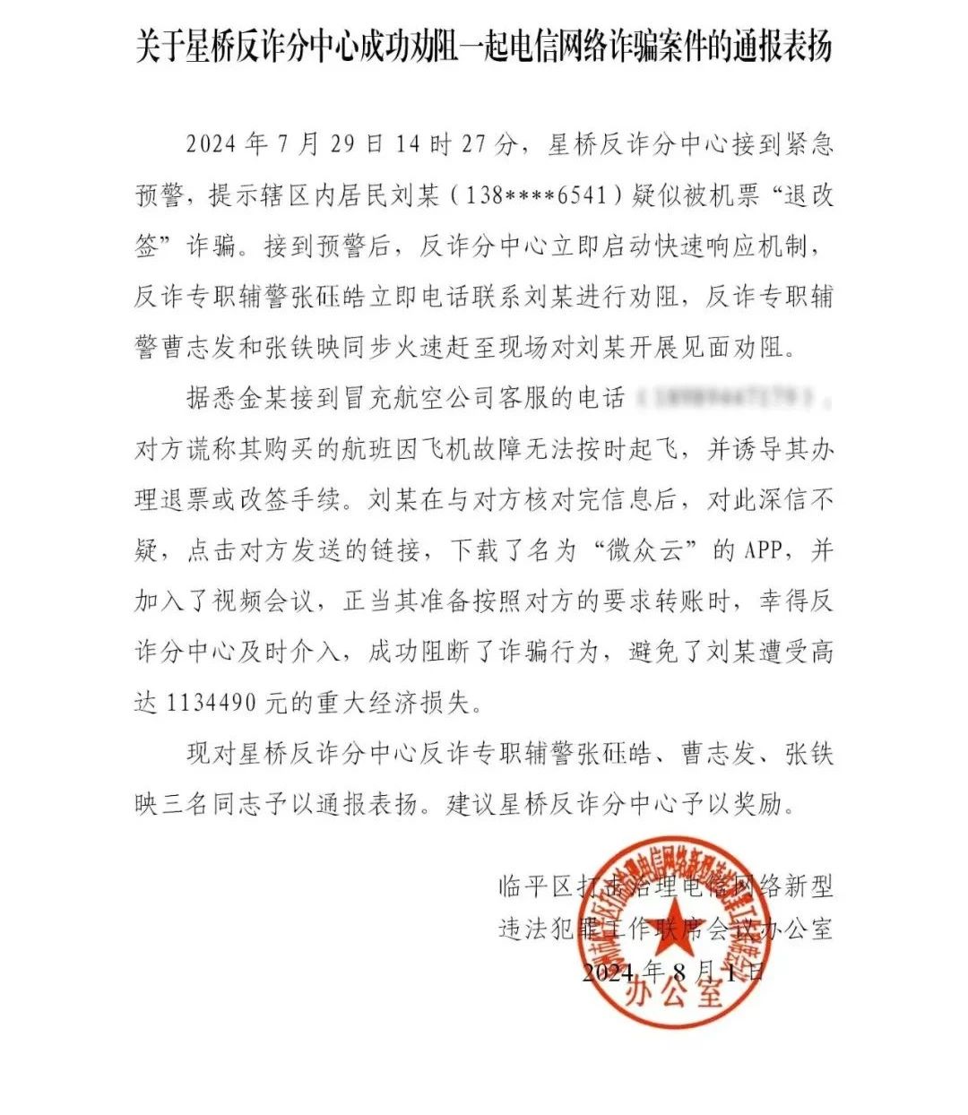 8月1日,杭州市臨平區(qū)打擊治理電信網(wǎng)絡(luò)新型違法犯罪工作聯(lián)席會議辦公室發(fā)出通報,表揚浙江民泰公司駐臨平區(qū)星橋派出所輔助項目員工張砡皓、曹志發(fā)和張鐵映出色的工作表現(xiàn)。