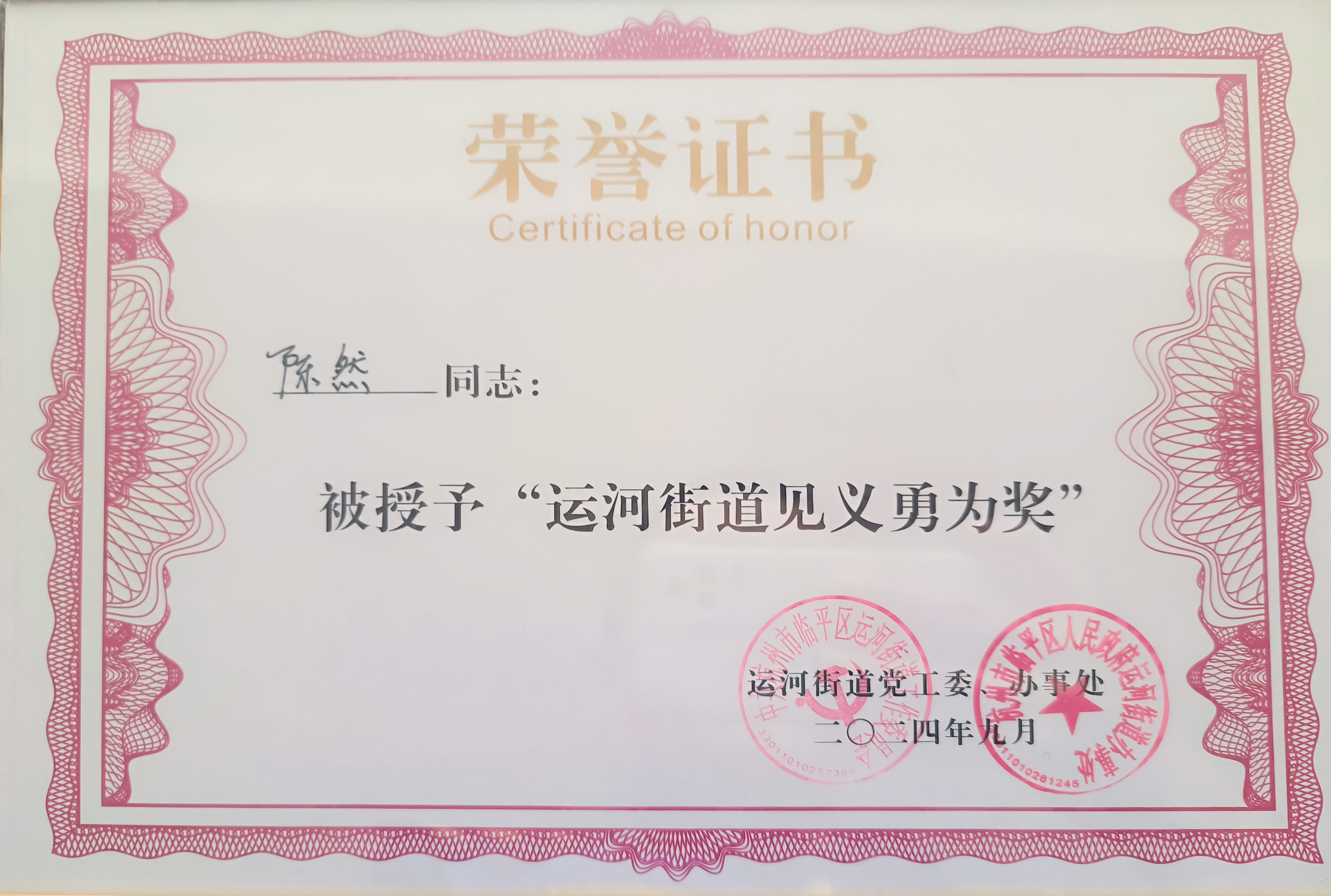 9月14日,浙江民泰公司駐杭州市臨平區(qū)運(yùn)河市容項(xiàng)目3名員工被運(yùn)河街道黨工委、辦事處授予“運(yùn)河街道見(jiàn)義勇為獎(jiǎng)”。