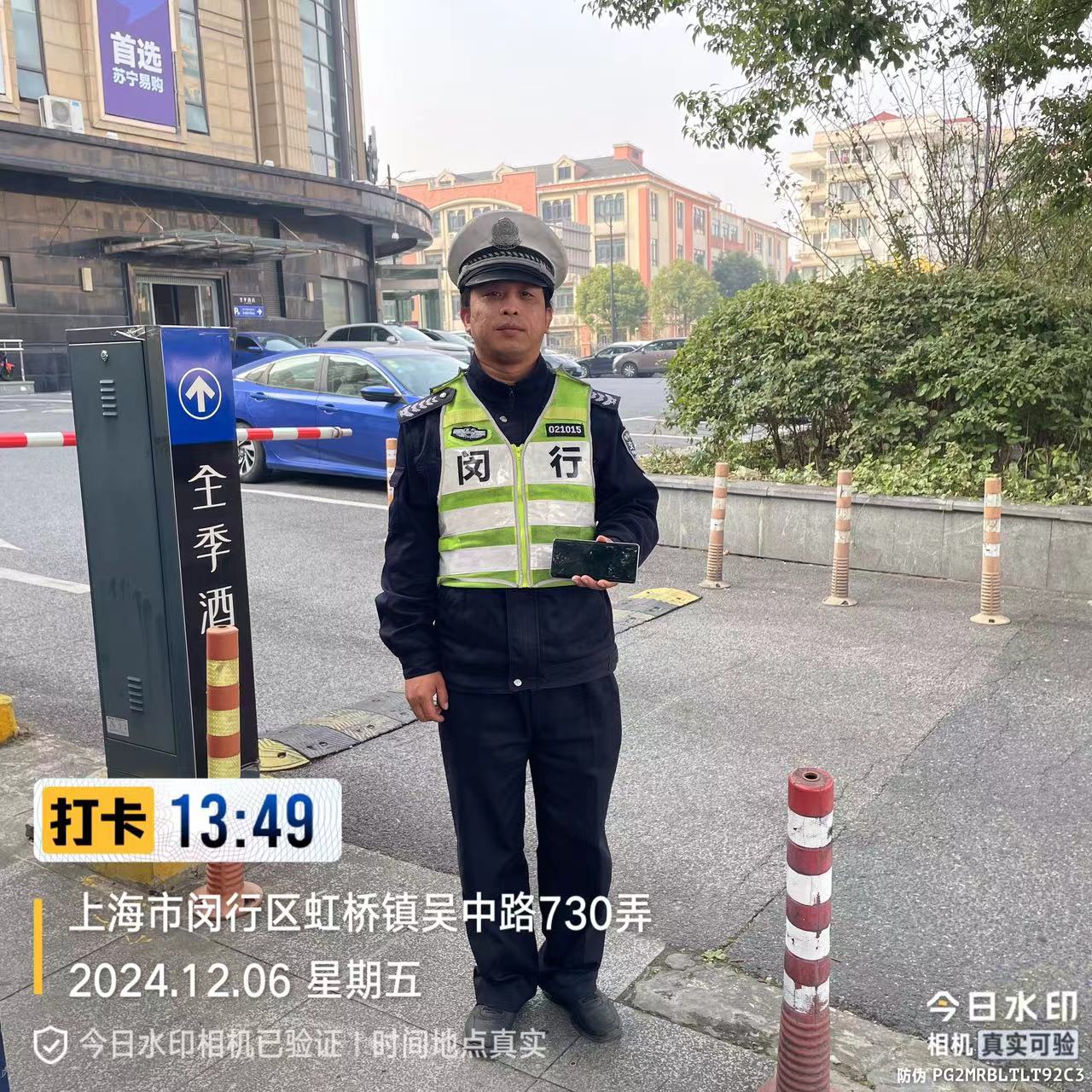 11月28日7:20,宗保公司駐閔行區(qū)虹橋交管輔助項目員工丁金在吳中路合川路路口執(zhí)勤時,撿到一部華為手機,詢問路人無果后,便將情況報告了項目負責人,并按指示在原地邊執(zhí)勤邊等待失主。
