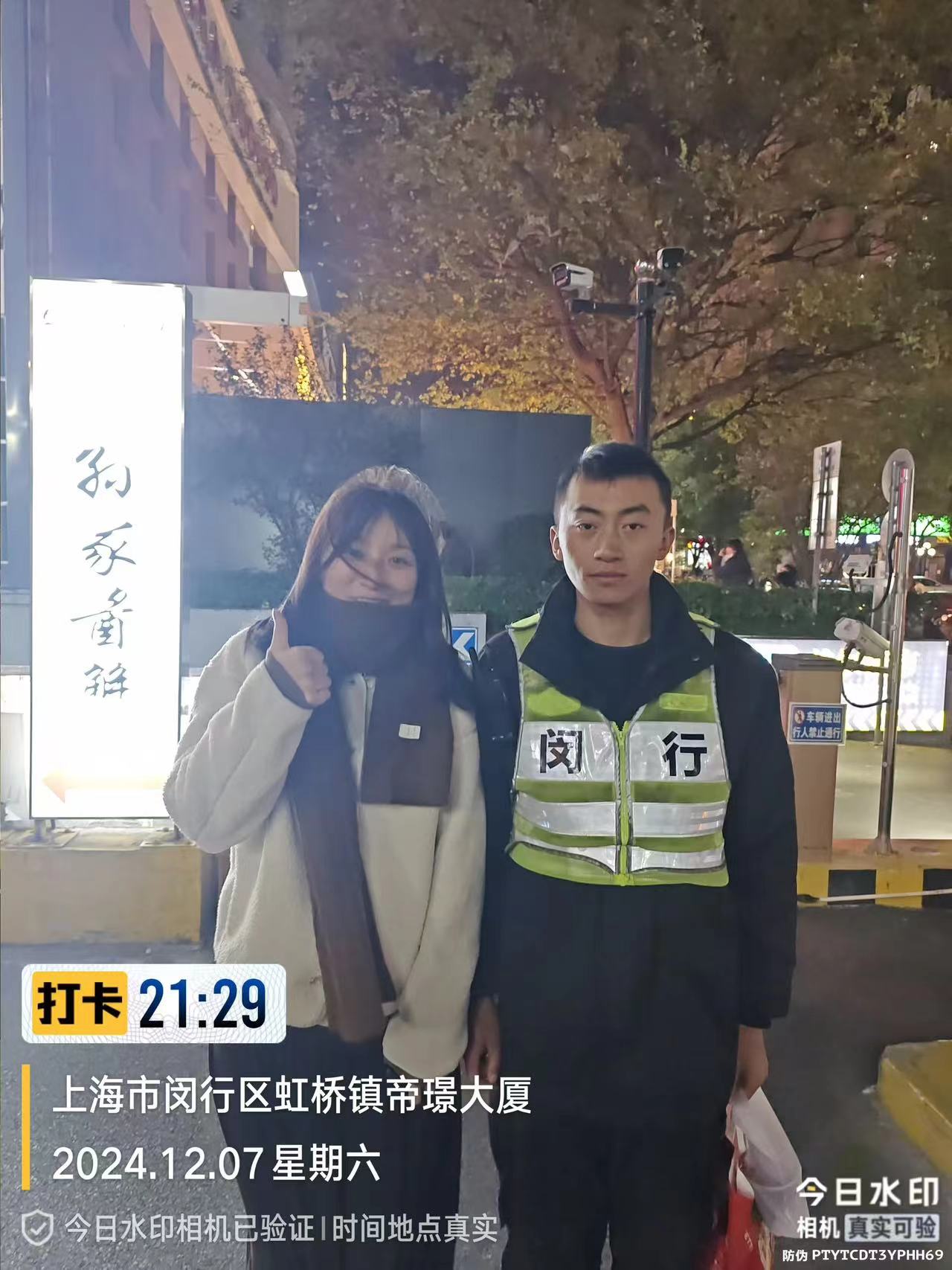 12月7日 20:27,宗保公司駐閔行區(qū)虹橋交管輔助項目員工殷建平在虹橋鎮(zhèn)井亭天地生活廣場附近巡邏時,撿到一部蘋果手機,報告班組長后便在原地等待。