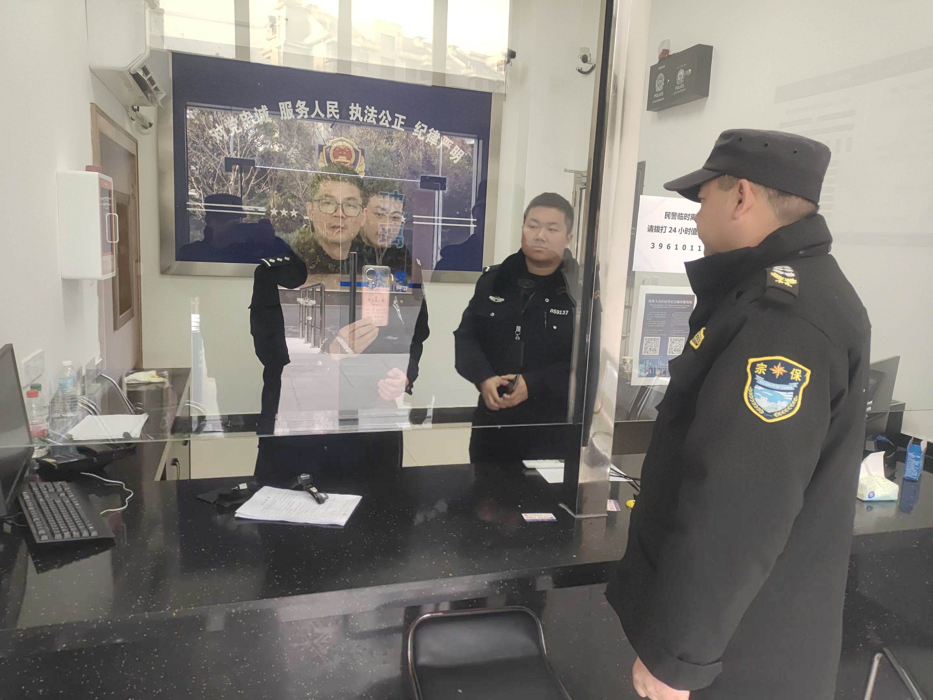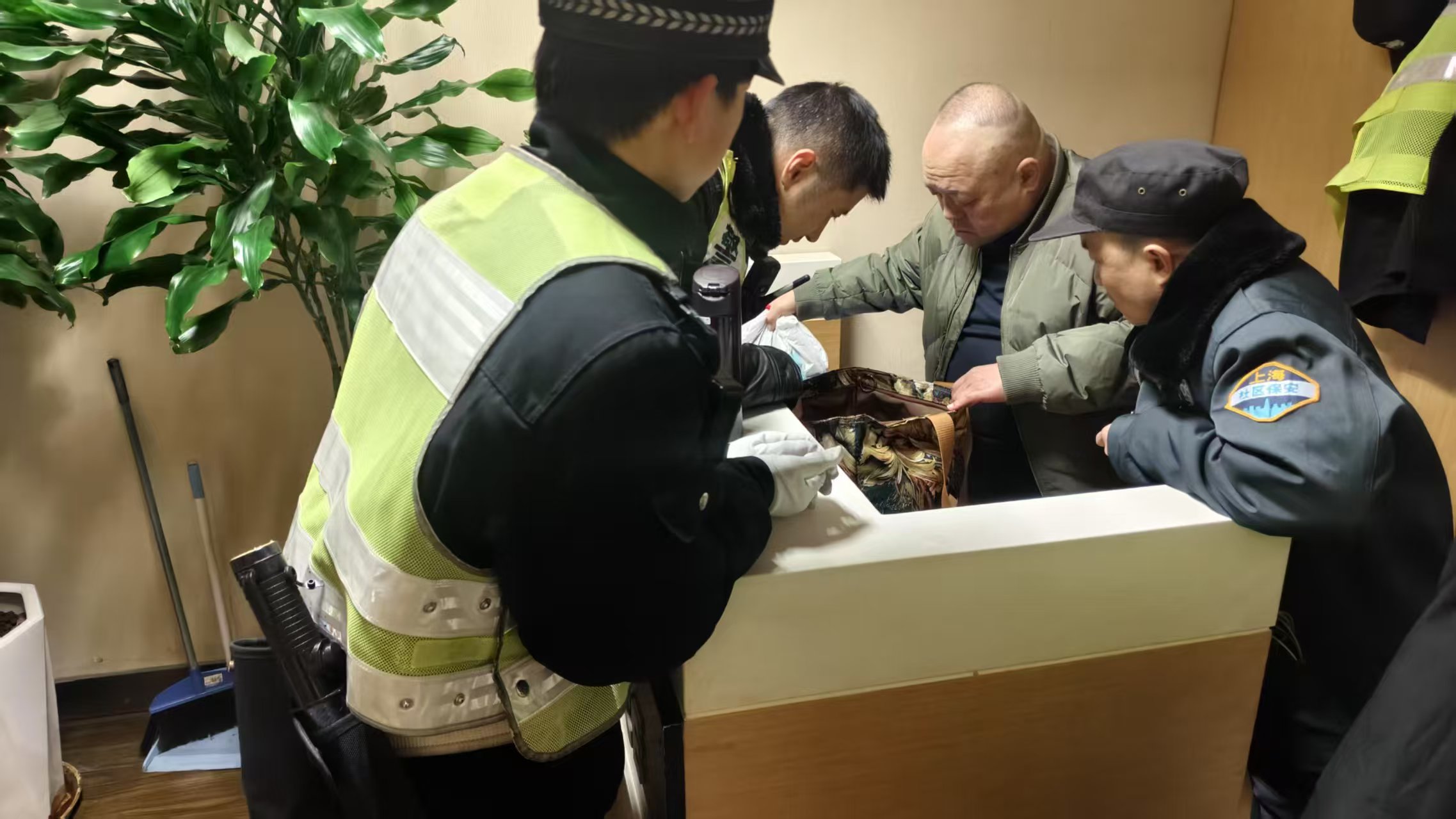1月29日19:11,宗保公司駐閔行區(qū)交通委項(xiàng)目員工顧成昊在虹橋樞紐康德思酒店附近執(zhí)勤時(shí),撿到一個(gè)裝有3張銀行卡、1張身份證、1個(gè)錢包以及若干衣物的挎包,報(bào)告項(xiàng)目隊(duì)長(zhǎng)后便在原地等待。