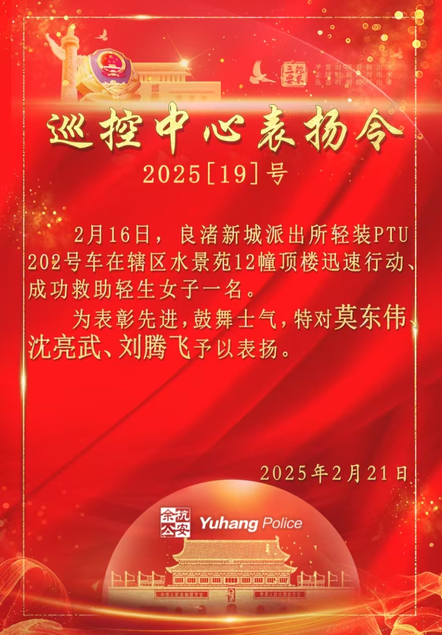 2月16日2:05,杭州市余杭區(qū)公安分局良渚新城派出所接到市民報警,稱有一名女子坐在水景苑12幢頂樓邊緣,疑似要輕生。接警后,余杭區(qū)公安分局巡控中心指令PTU202號車組迅速趕往現(xiàn)場處置。2月21日,民泰公司駐杭州市余杭區(qū)良渚新城派出所輔助項目員工劉騰飛與派出所PTU202號車長莫東偉、隊員沈亮武因成功救下一名欲跳樓輕生女子,受到了余杭區(qū)公安分局巡控中心的通報表揚。(供稿人:楊有福)