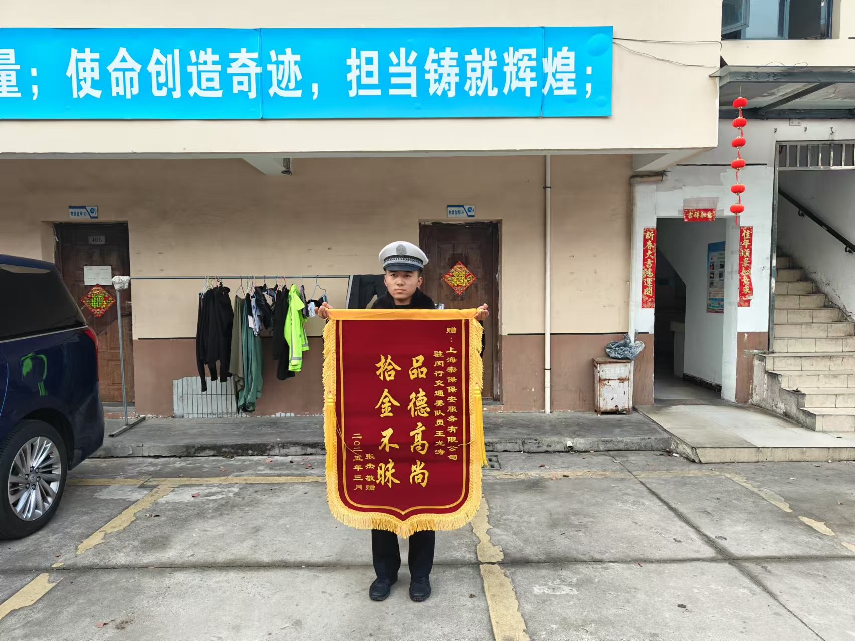 01宗保公司駐閔行區(qū)交通委項目員工王龍濤拾金不昧,獲市民錦旗致謝