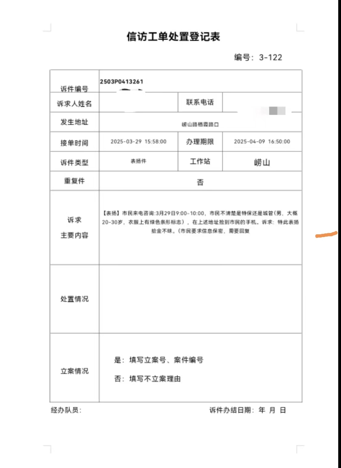 3月31日16:20,宗保公司駐浦東新區(qū)周浦市容項(xiàng)目員工田紅開(kāi)在年家浜路巡查時(shí),撿到一部紫色華為手機(jī)??紤]到失主可能會(huì)返回尋找,就在原地邊值勤邊等待。