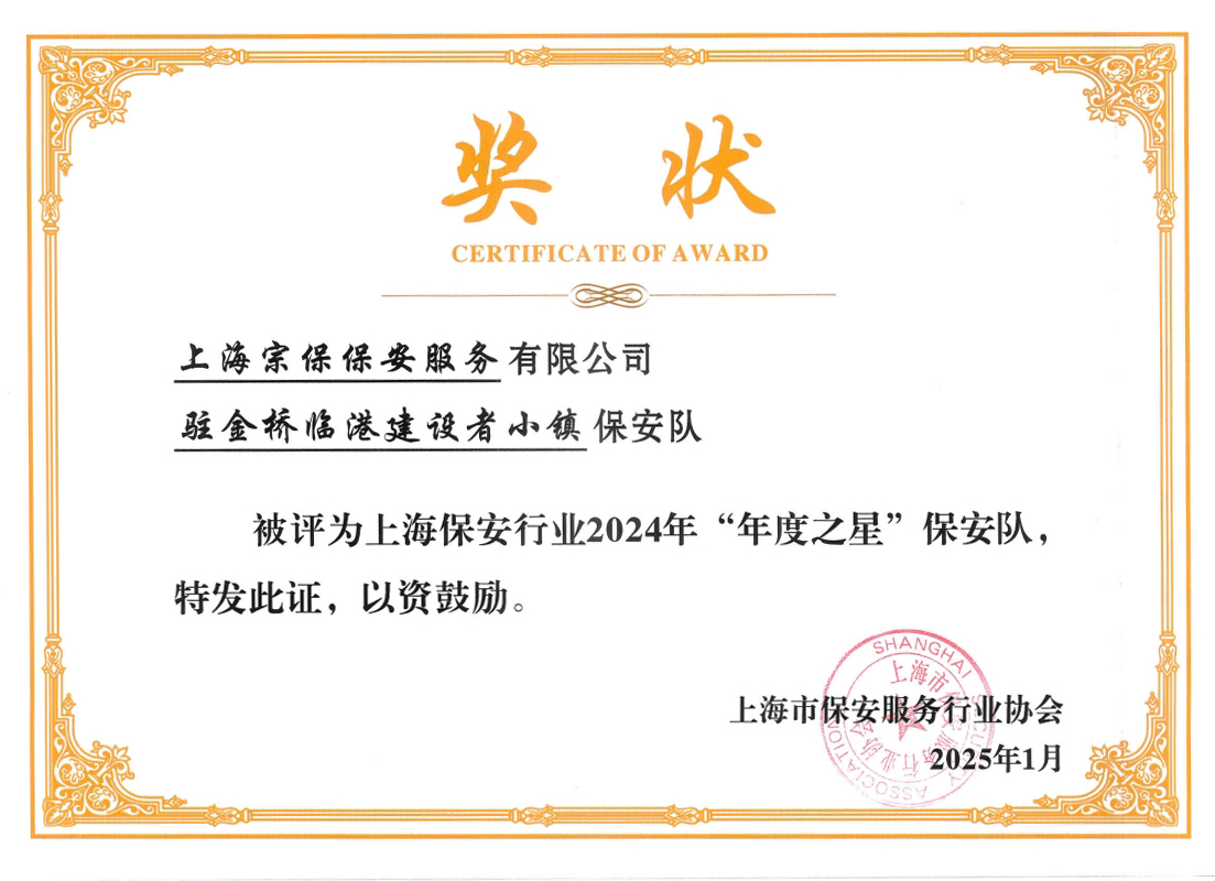公司駐金橋臨港建設(shè)者小鎮(zhèn)保安隊被評為“年度之星”保安隊