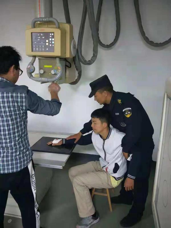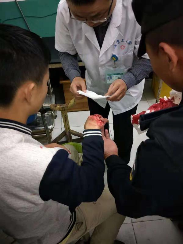 當(dāng)天18:30分,黃山二中九年級(jí)六班學(xué)生王洋在宿舍樓下玻璃門(mén)上做引體向上,不小心把手碰在玻璃上,嚴(yán)重受傷,血流滿地。因失血過(guò)多加上驚嚇,王洋嘴唇發(fā)白,身體站不穩(wěn)。 此時(shí)正在附近訓(xùn)練的宗保特保隊(duì)員得知消息后,第一時(shí)間趕到學(xué)校,把王洋送到最近的甘棠醫(yī)院治療,同時(shí)與學(xué)校老師取得聯(lián)系。因傷勢(shì)嚴(yán)重,王洋被甘棠醫(yī)院拒收,后又不得不送到龍井醫(yī)院。期間,李鵬程等宗保特保隊(duì)員一路狂奔,送醫(yī)院、轉(zhuǎn)醫(yī)院、掛號(hào)、找醫(yī)生,全程陪護(hù)學(xué)生做完一系列的檢查。經(jīng)過(guò)緊急救治,該學(xué)生已無(wú)大礙。