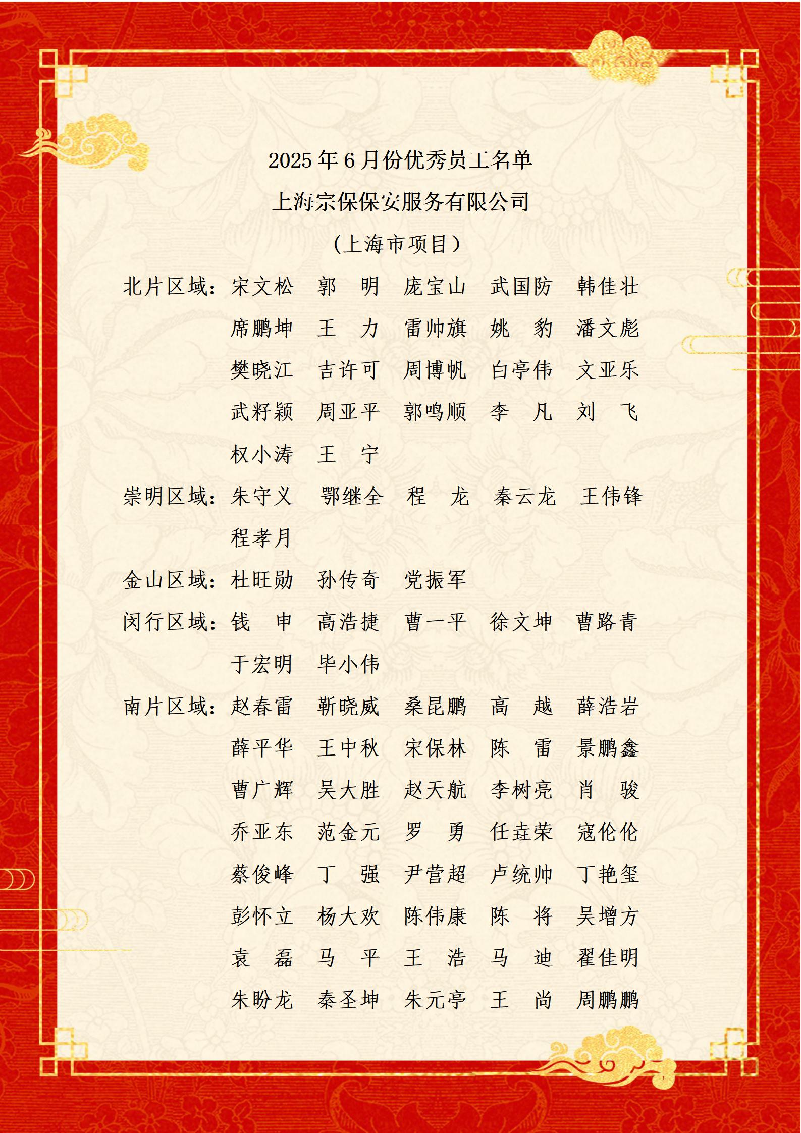 6月份,公司廣大員工根據(jù)甲方的任務要求,按照公司的部署安排,認真踐行公司“誠信為本 服務至上”的經(jīng)營理念,甘于擔當、善于作為,助力完成了攜程Envision 2025全球合作伙伴大會以及高考、中考考點秩序維護等保障任務,全力配合甲方做好了城市管理輔助、治安巡邏聯(lián)防、物業(yè)服務保障、生態(tài)環(huán)境保護、高鐵線路巡防、社區(qū)消防救援等工作。期間,涌現(xiàn)出了一批盡心履責、崗位建功、拾金不昧、熱心助人的優(yōu)秀員工和先進典型。