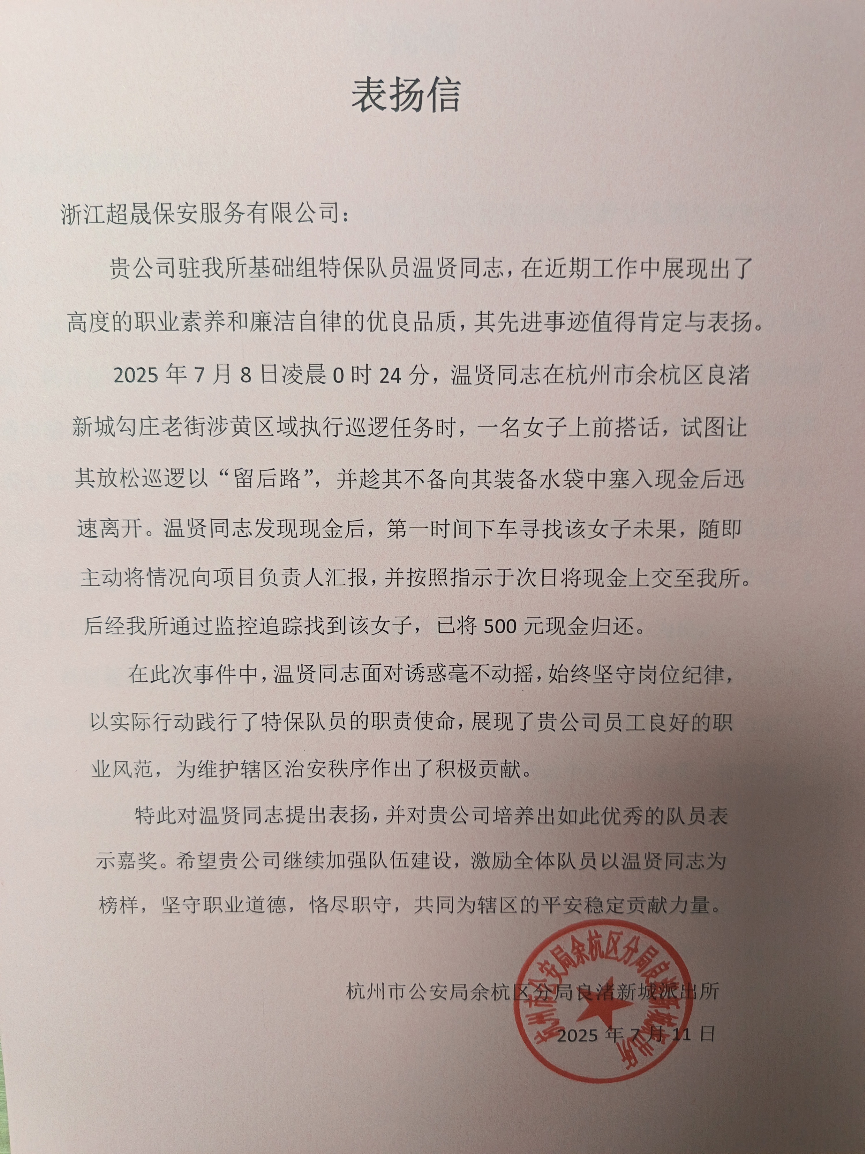 7月11日,公司收到杭州市公安局余杭區(qū)分局良渚新城派出所的表揚信,信中贊揚公司員工溫賢保持職業(yè)操守、嚴(yán)守工作紀(jì)律的優(yōu)良品質(zhì),感謝他用實際行動踐行特保隊員職責(zé)使命,為助力維護(hù)轄區(qū)治安秩序作出的積極貢獻(xiàn)。