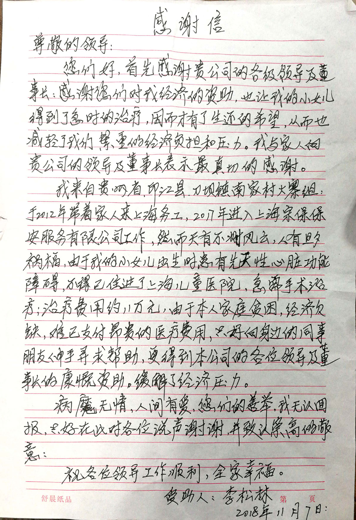 原來,今年2月李松林與愛人生了一個女兒。孩子剛剛出生,就查出患先天性心臟病。3月份,在上海兒童醫(yī)學中心動了第一次手術。高額的手術費不僅花光了夫妻的積蓄,還讓他們背上不少債務,使這個本就不富裕的家庭更是雪上加霜。11月份的第二次手術迫在眉睫,“錢從哪里出”成了小李全家翻不過去的大山。
