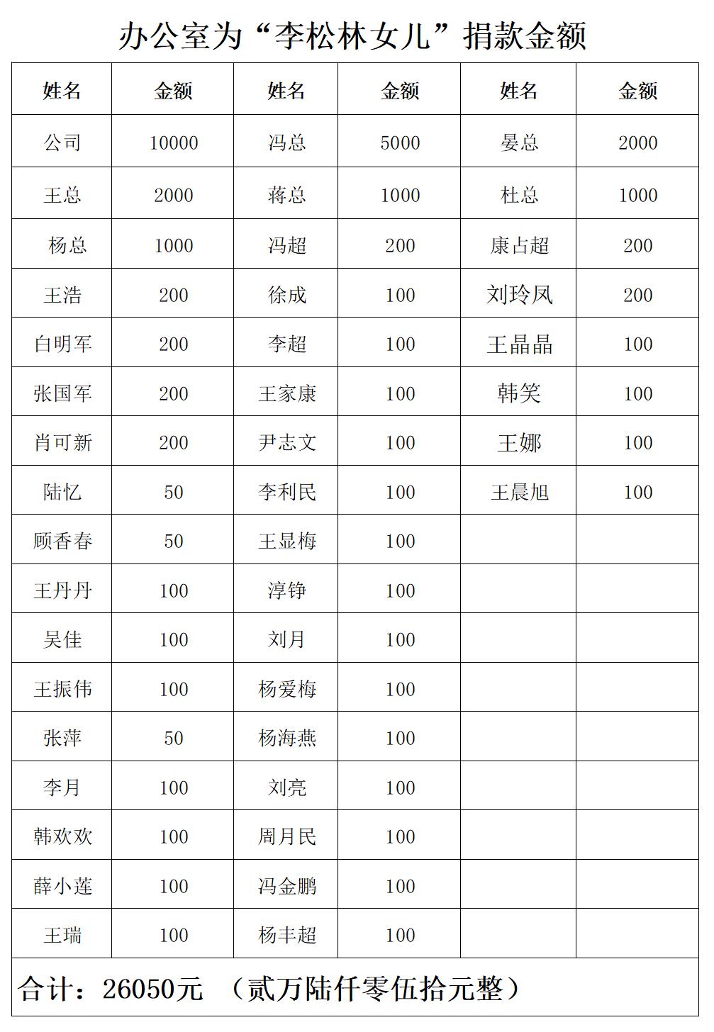 涓涓細流可以流淌成浩瀚大海,點滴愛心可以匯聚成愛的洪流。今天大家的愛心將會化作李松林全家堅強的動力和明天的希望。此次捐款活動充分體現(xiàn)了宗保公司廣大員工團結友愛、互幫互助的美德;彰顯了宗保公司奉獻、友愛、互助、進步的時代新風。我們堅信:只要人人都獻出一點愛,世界將變成美好的人間。