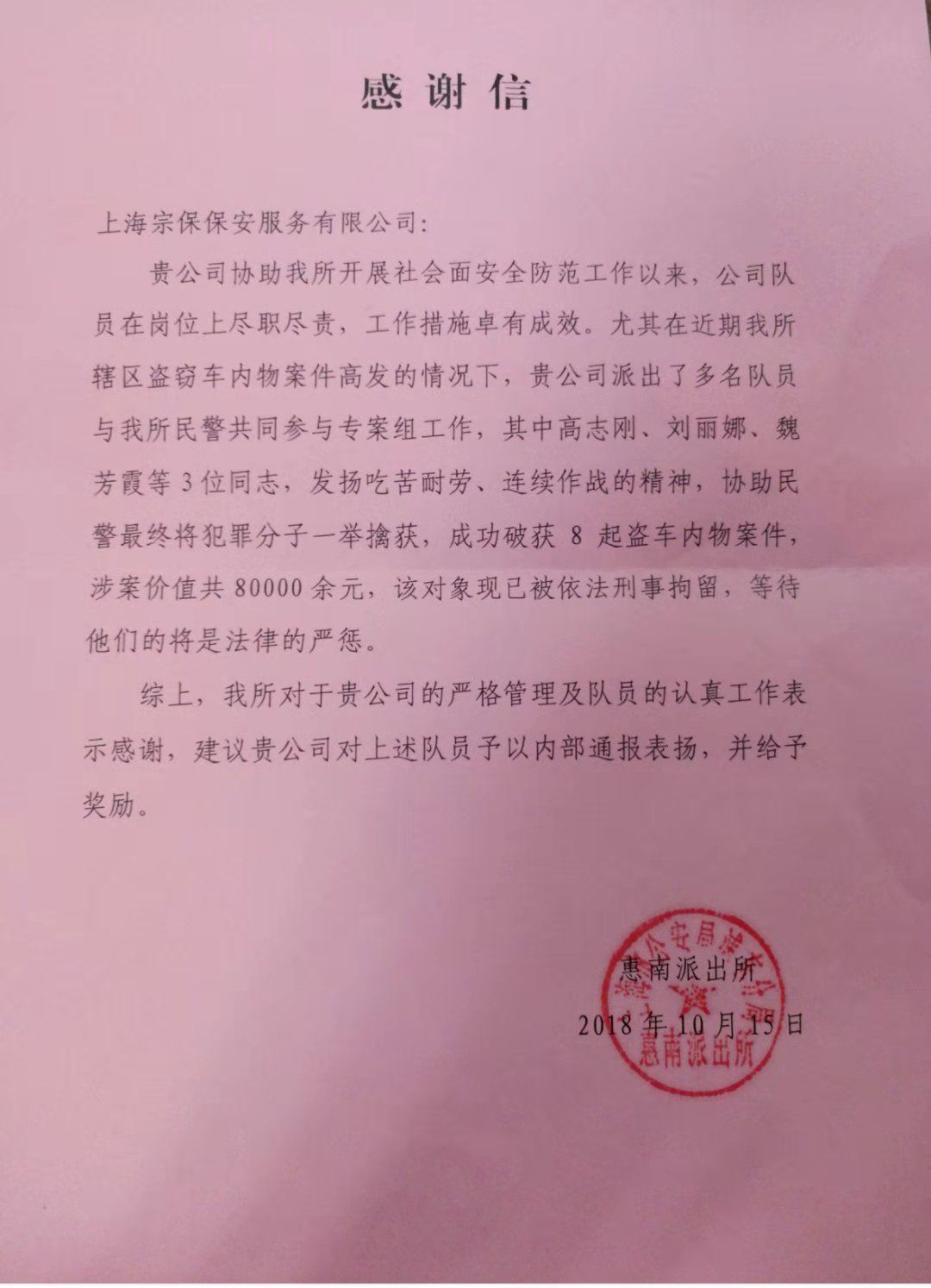 惠南派出所對(duì)宗保公司的嚴(yán)格管理及對(duì)他們工作上的大力支持深表感謝,對(duì)隊(duì)員們的認(rèn)真工作表示認(rèn)可及贊揚(yáng)。事后惠南派出所還特意向宗保公司寫來了感謝信。
