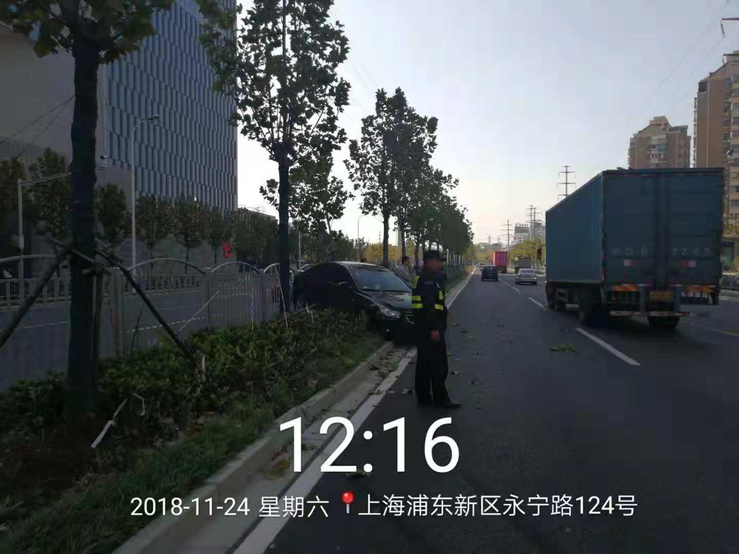 12:00左右,當(dāng)宗保駐金橋輔警項(xiàng)目巡邏隊(duì)員,巡邏經(jīng)過(guò)金橋地鐵站附近時(shí),發(fā)現(xiàn)路上發(fā)生了一起車禍,因一輛大卡車強(qiáng)行變道,撞上小轎車車尾,導(dǎo)致小轎車撞向綠化帶,所幸事故中無(wú)人傷亡。隊(duì)員許偉立即向帶班組長(zhǎng)匯報(bào)情況,并和隊(duì)友及金橋城管巡邏隊(duì)員一起參與到交通事故救助中,一起保護(hù)現(xiàn)場(chǎng),維持交通秩序,等待交警來(lái)處理。