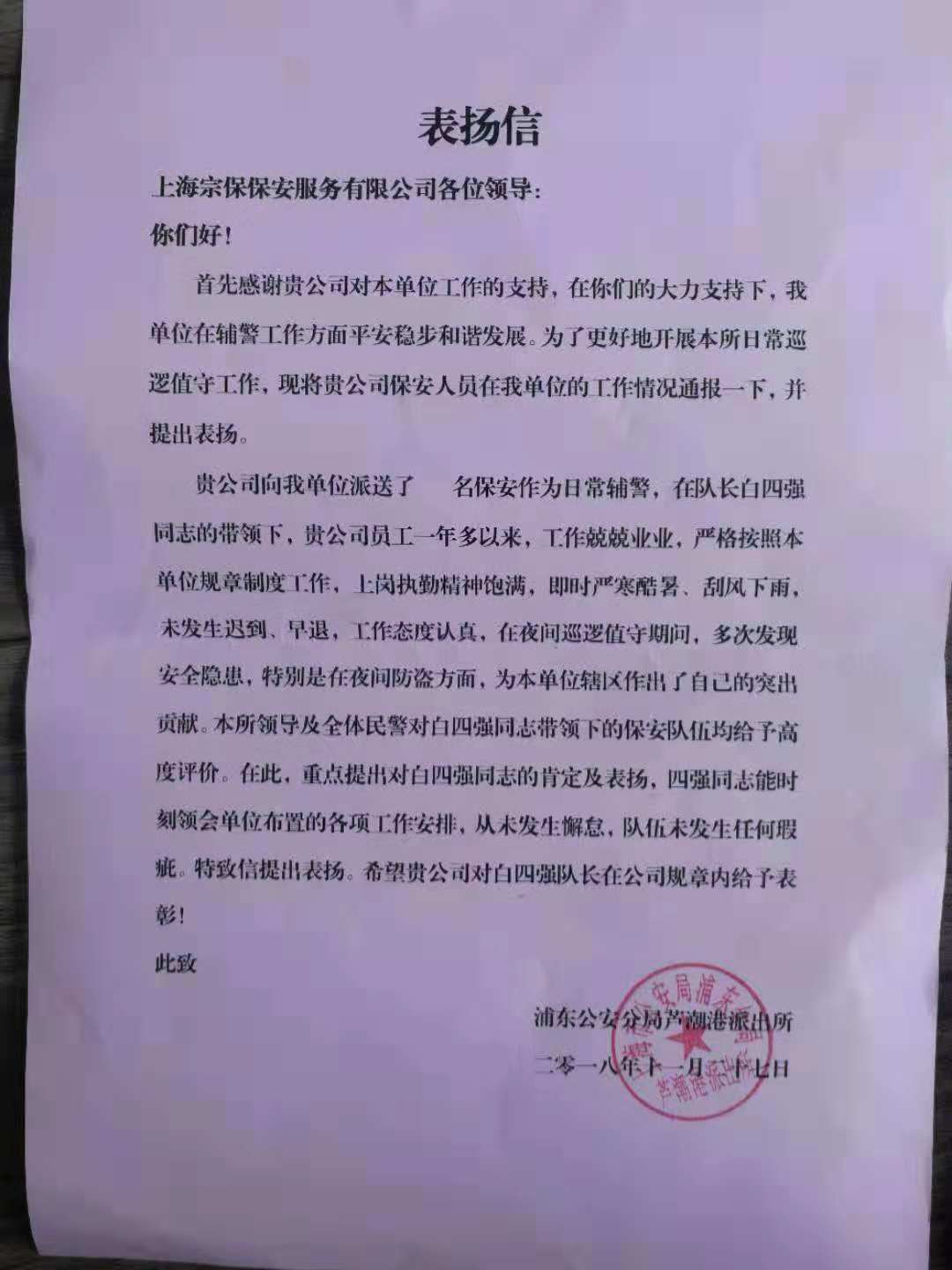 2018年11月30日,宗保保安公司駐蘆潮港項(xiàng)目收到一封表揚(yáng)信,信件來自于浦東公安分局蘆潮港派出所,信上對于宗保保安公司的工作給予高度認(rèn)可。