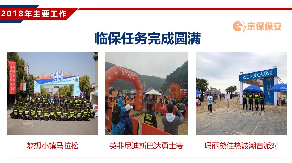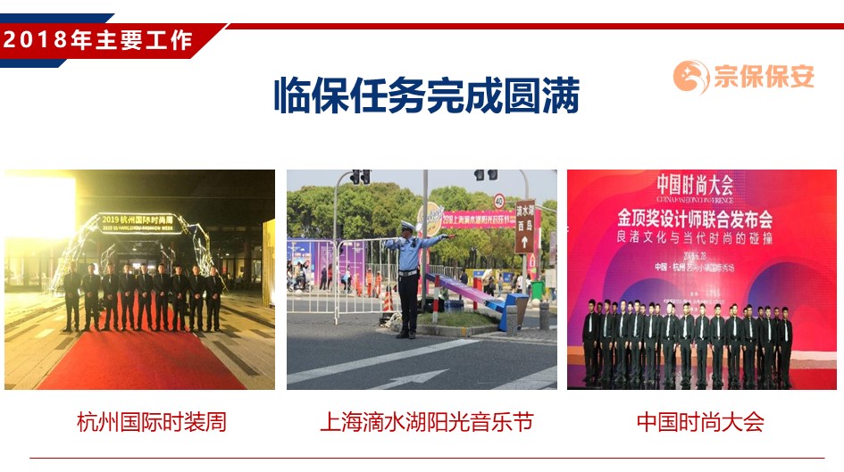 為百姓排憂解難,為政府保駕護航。夢想小鎮(zhèn)半程馬拉松賽,2000多名隊員從上海奔赴杭州保障,人數(shù)多、距離遠(yuǎn)、戰(zhàn)線長,既是管理能力的考驗,也是公司實力的展示;“五一”、“十一”臨港系列活動,人防、技防相互支撐、互相補位,成效顯著;英菲尼迪斯巴達(dá)勇士賽、中國時尚大會、中國青年數(shù)字經(jīng)濟創(chuàng)業(yè)大賽、杭州星空長灘音樂狂歡、西湖公共關(guān)系論壇會議等,大型活動安保一項接一項,人氣爆棚,又秩序井然?;顒蝇F(xiàn)場秩序維護、交通疏導(dǎo)、路線警衛(wèi)、停車場管理,處處都有宗保人的身影。有作為才能有地位。腳踏實地的宗保人用自己的實際工作贏得了社會的認(rèn)可和尊重。
