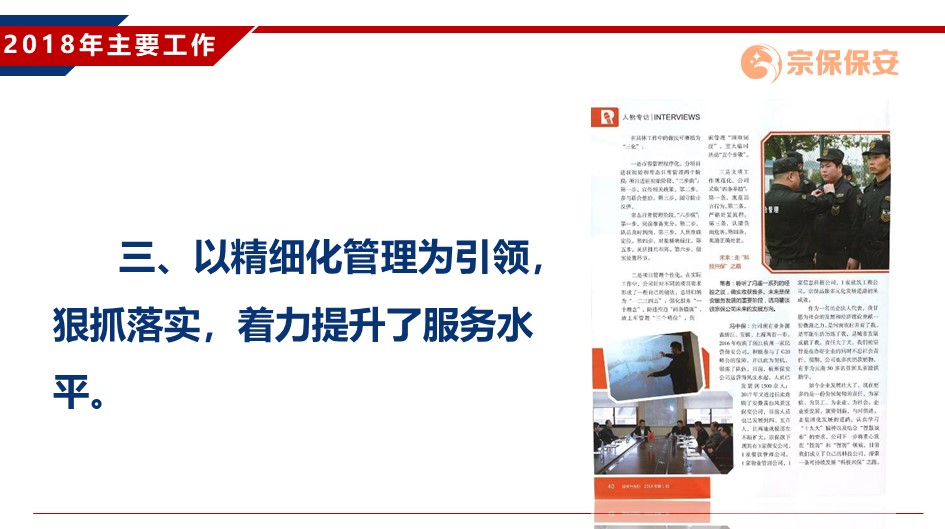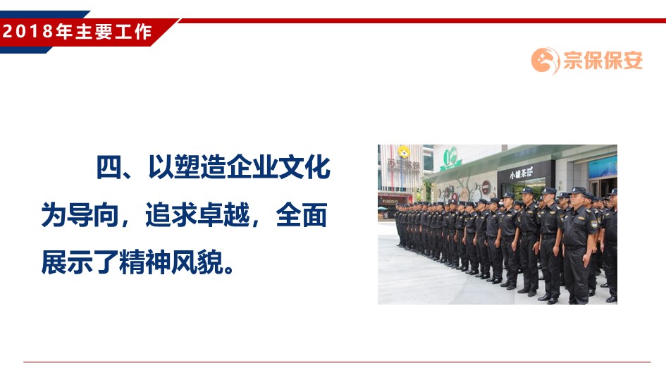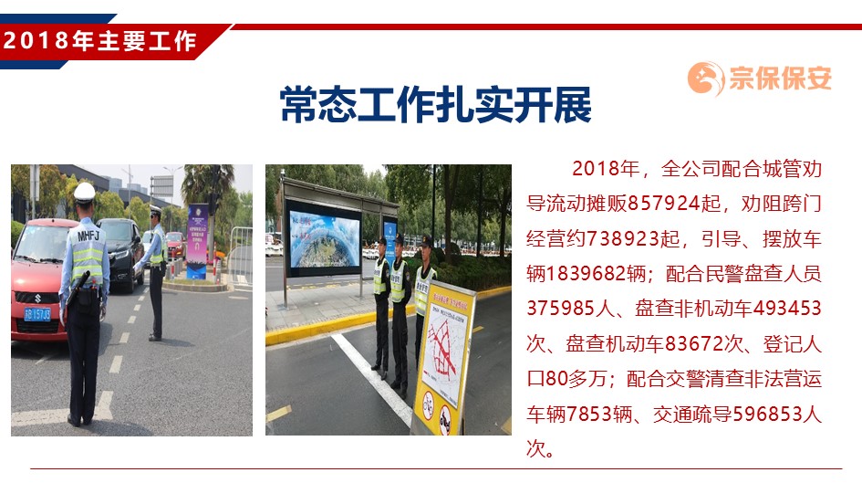 不忘初心,牢記使命。2018年,全公司配合城管勸導(dǎo)流動攤販857924起,勸阻跨門經(jīng)營約738923起,引導(dǎo)、擺放車輛1839682輛;配合民警盤查人員375985人、盤查非機動車493453次、盤查機動車83672次、登記人口80多萬;配合交警清查非法營運車輛7853輛、交通疏導(dǎo)596853人次。天量數(shù)據(jù)的背后,是宗保人對自己承諾的嚴(yán)格落實,對甲方單位的認(rèn)真負(fù)責(zé),對業(yè)務(wù)工作的一絲不茍。