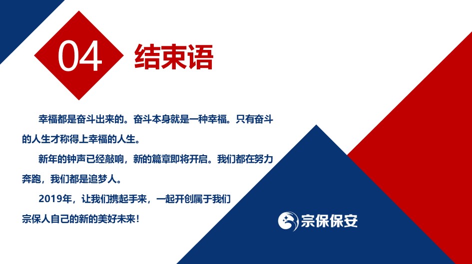 幸福都是奮斗出來的。新時代是奮斗者的時代,神州大地是奮斗者的舞臺。奮斗本身就是一種幸福。只有奮斗的人生才稱得上幸福的人生。新年的鐘聲已經(jīng)敲響,新的篇章即將開啟。我們都在努力奔跑,我們都是追夢人。2019年,有機遇也有挑戰(zhàn),大家還要一起拼搏、一起奮斗,讓我們攜起手來,一如既往地秉承公司的文化、理念,腳踩實地,埋頭苦干,一起開創(chuàng)屬于我們宗保人自己的新的美好未來!