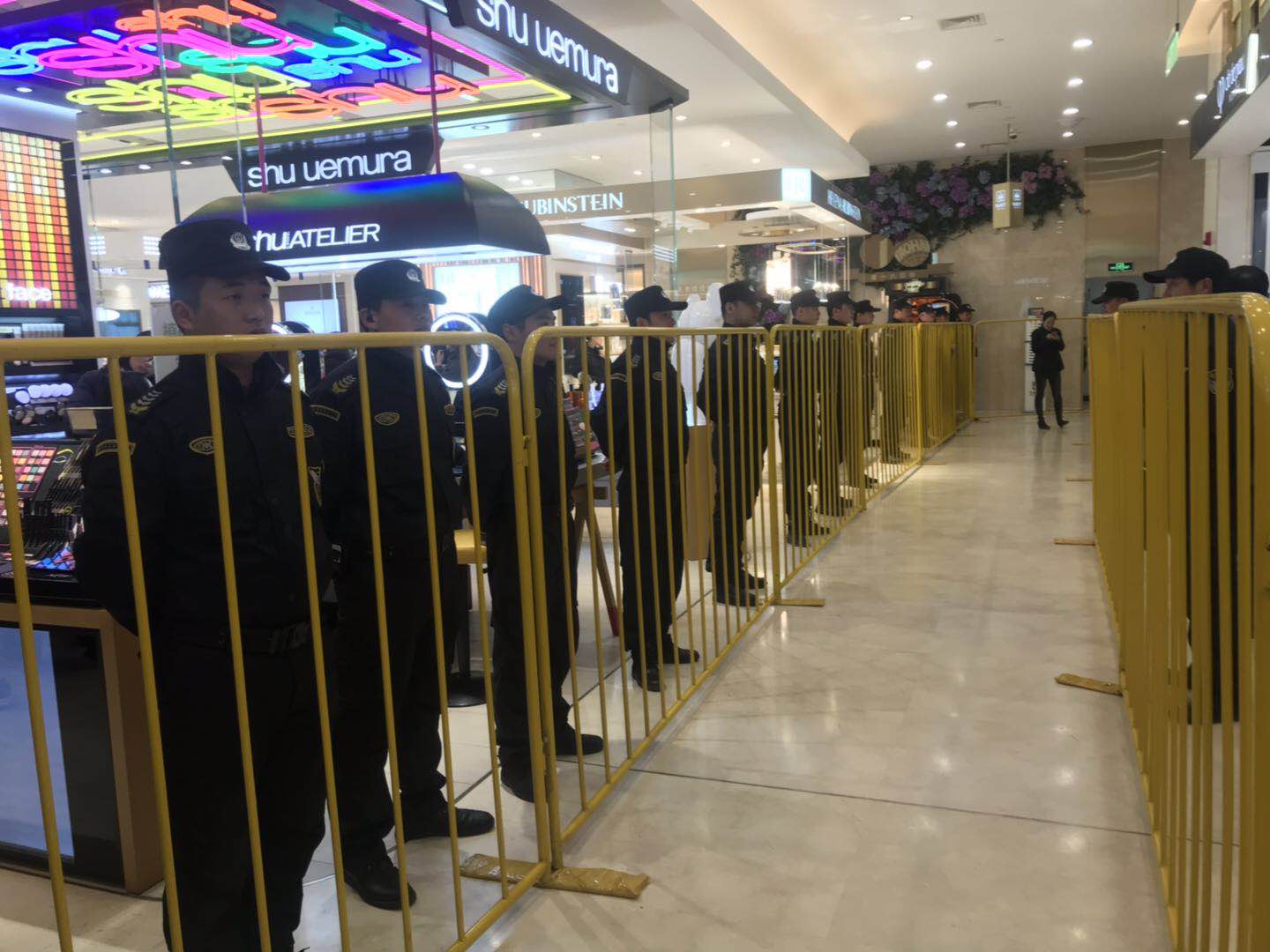 由于活動當(dāng)天為周末,顧客較多,再加上有新生代當(dāng)紅明星現(xiàn)場互動,容易引起大量粉絲及顧客圍觀。公司領(lǐng)導(dǎo)親自現(xiàn)地勘察,多次溝通轄區(qū)派出所,反復(fù)推敲保障方案,制定多套應(yīng)急預(yù)案,最終敲定方案,確?;顒幽馨踩樌恼归_。