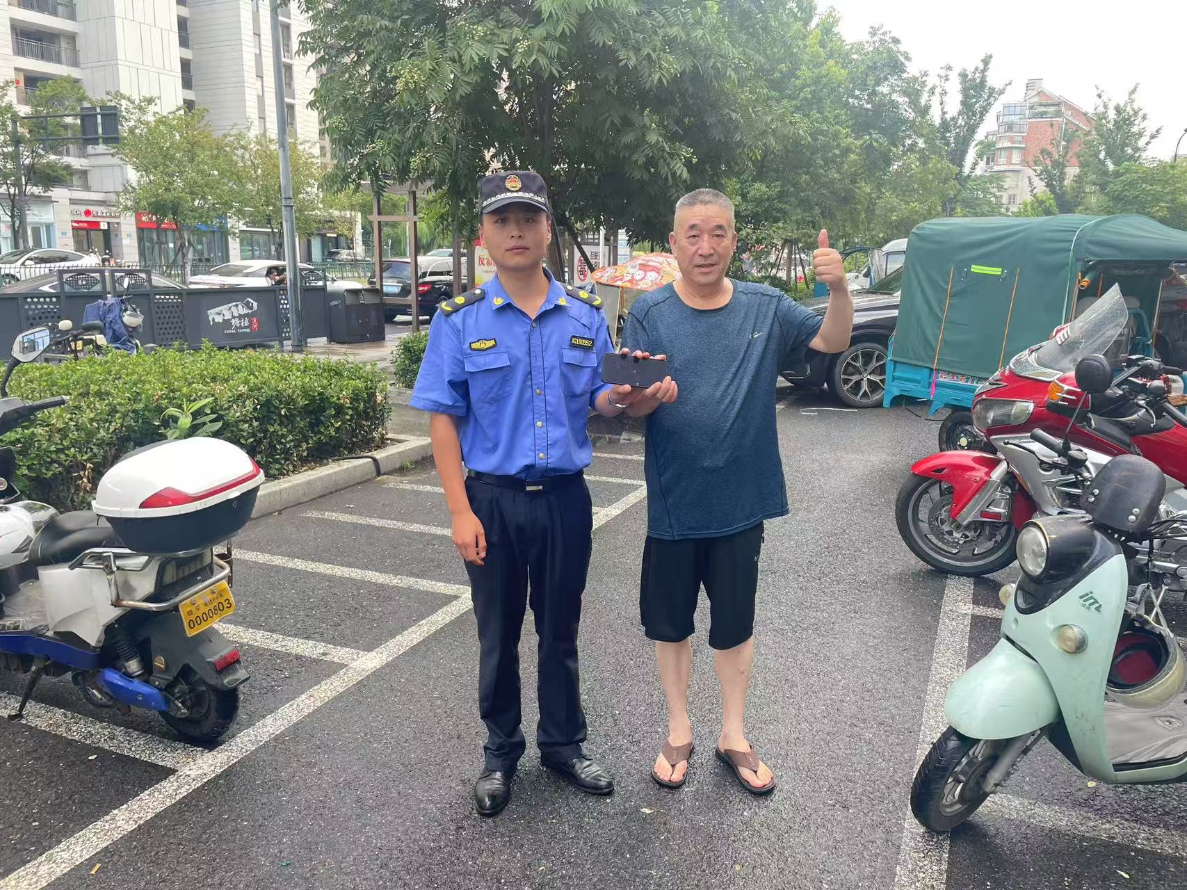7月28日8:20,浙江民泰公司駐杭州市臨平區(qū)塘棲市容項(xiàng)目員工李冠峰在運(yùn)河街道范家斗農(nóng)貿(mào)市場(chǎng)巡查時(shí),撿到一部華為手機(jī)。報(bào)告項(xiàng)目負(fù)責(zé)人后,李冠峰便在原地邊巡查邊等待失主。