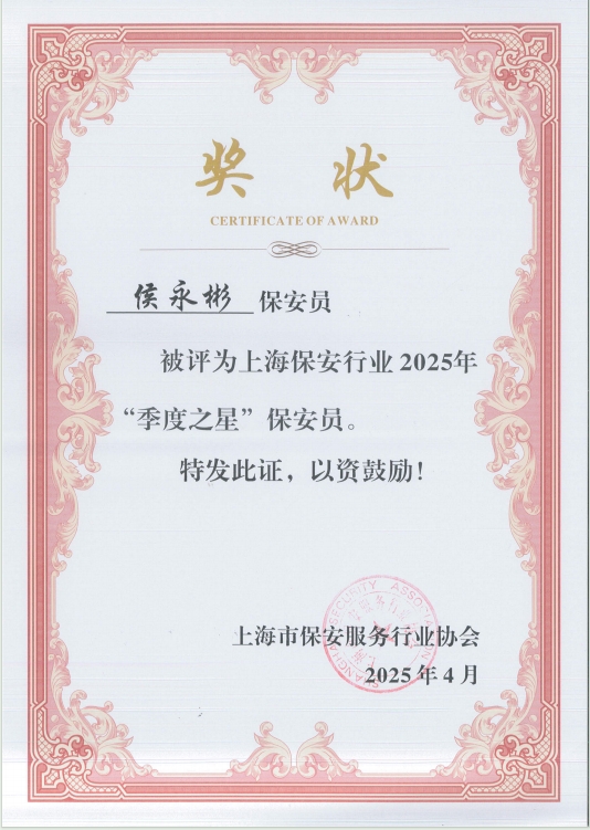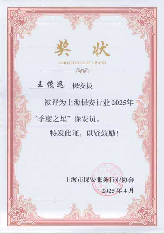近日,上海市保安服務(wù)行業(yè)協(xié)會(huì)公布了“季度之星”保安隊(duì)、“季度之星”保安員評(píng)選結(jié)果,宗保公司1個(gè)項(xiàng)目保安隊(duì)和3名員工個(gè)人獲得殊榮。