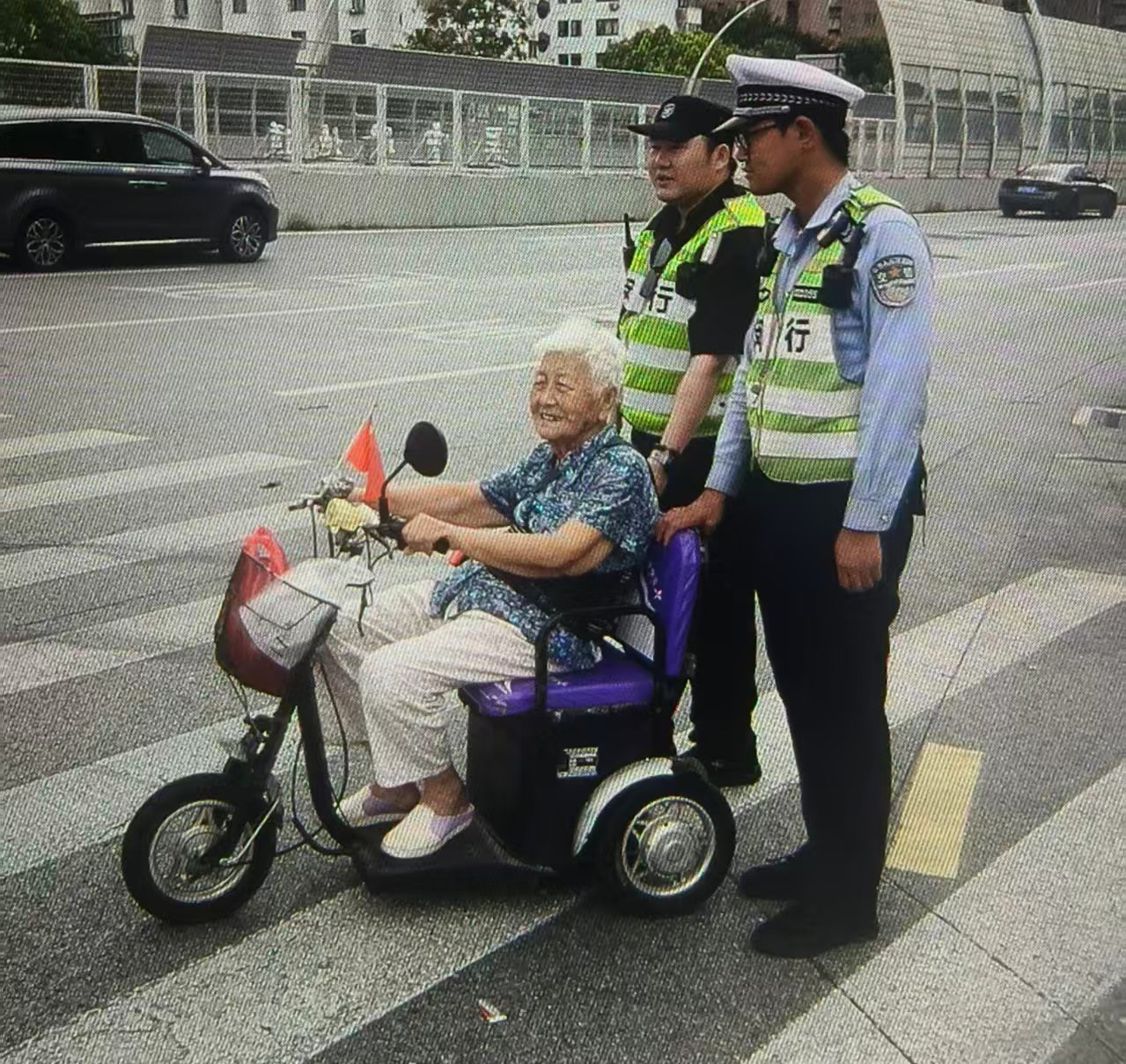 了解情況后,兩人立即向帶班負(fù)責(zé)人匯報,并按照指示主動伸出援手。他們請老奶奶坐在車上掌控方向,自己則一左一右輪流推著,小心翼翼地沿路邊緩慢前行。途中,他們不時提醒老人注意避讓行人車輛,確保一路安全。