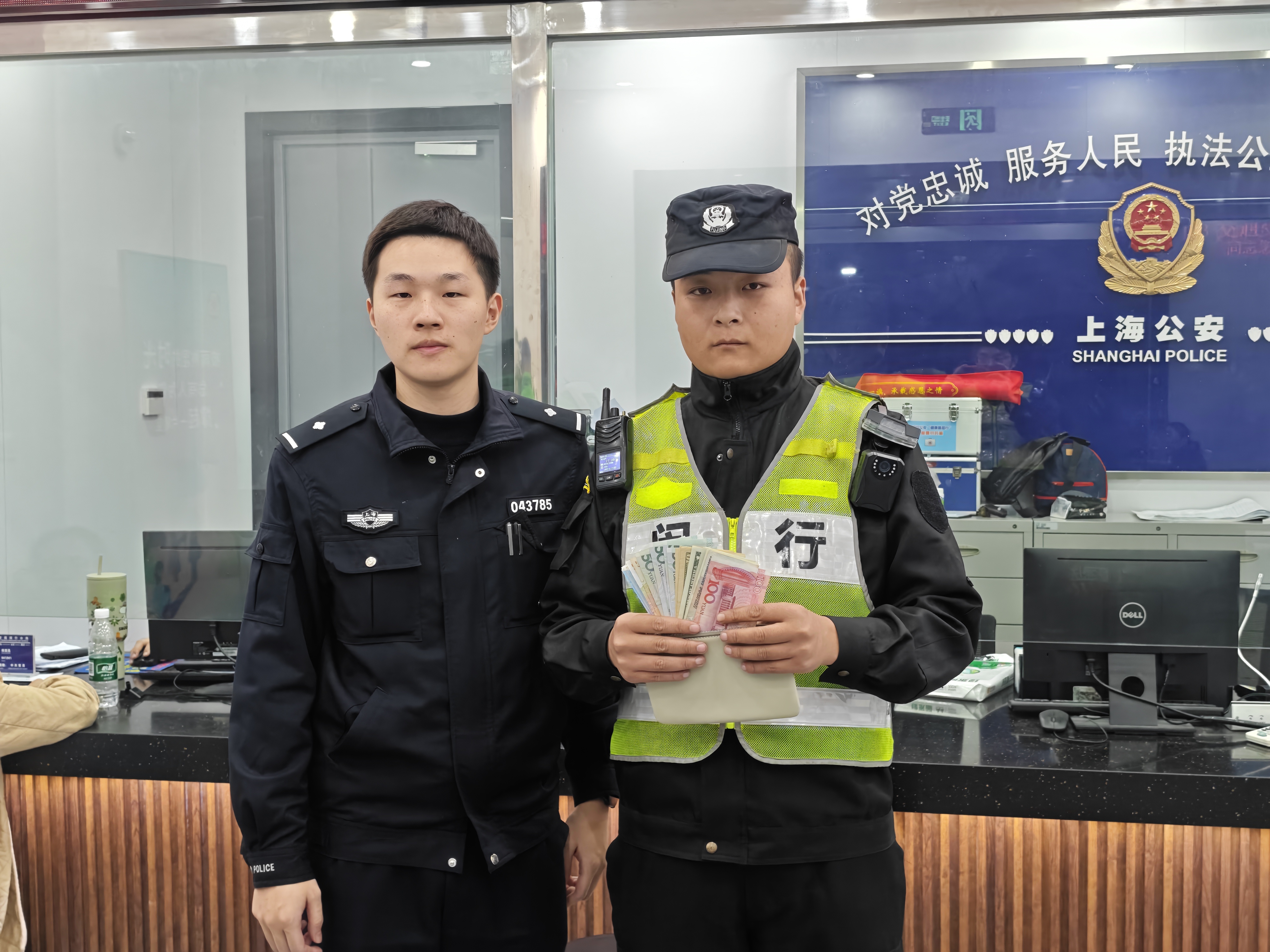 11月13日15:00 ,宗保公司駐閔行區(qū)虹橋交管輔助項目員工馮夢超在萬象城虹莘出入口附近巡邏時,撿到一個米色錢包,內有467元人民幣、若干美元和若干盧布。因一時無法聯(lián)系到失主,馮夢超便將情況報告了帶班組長,并在原地邊巡邏邊等待失主。