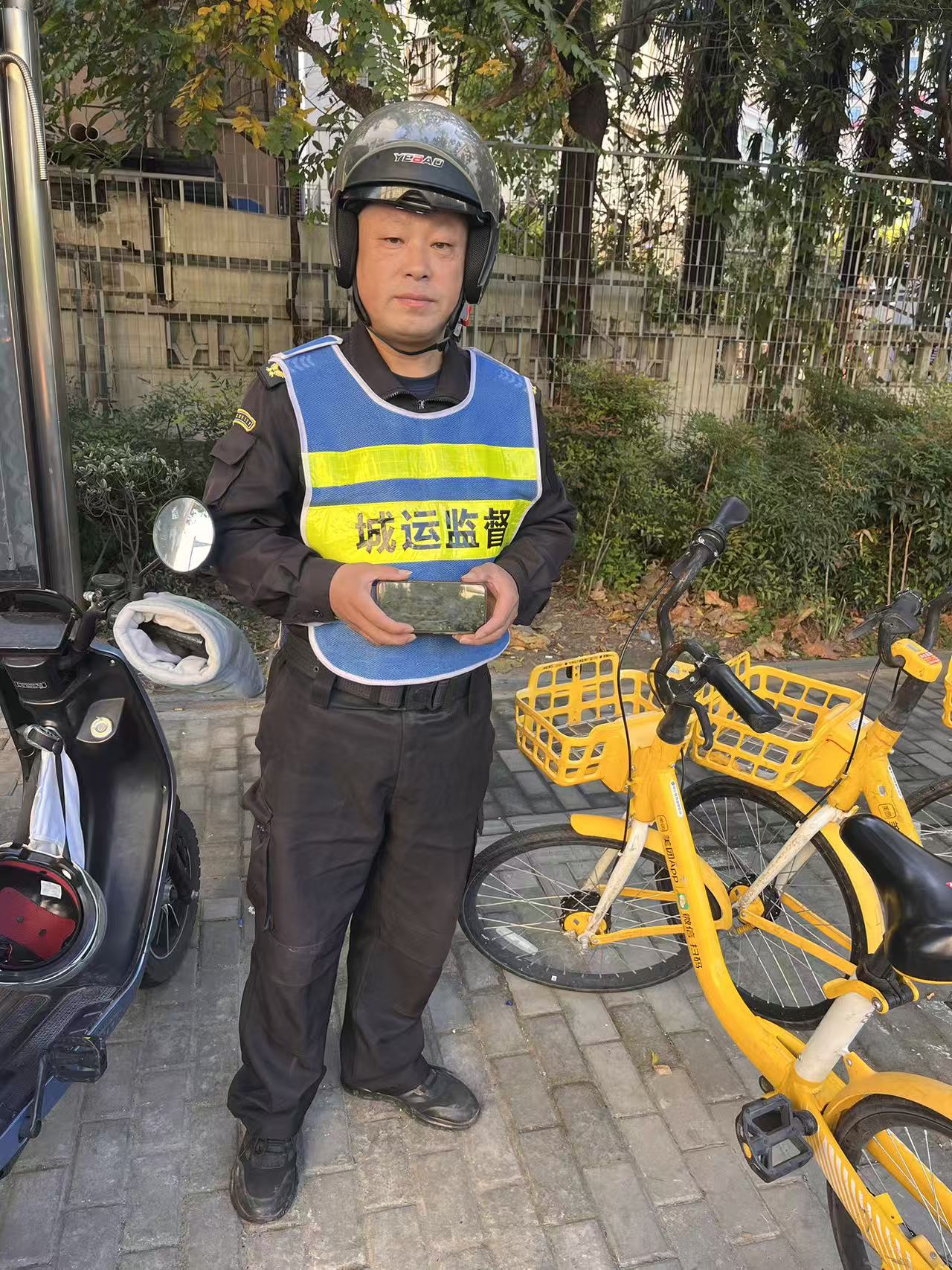 11月13日8:00,宗保公司駐浦東新區(qū)南碼頭路街道城運輔助項目員工陳安生在浦東南路浦三路公交車站整理共享單車時,在一輛共享單車車框里發(fā)現一部Vivo 手機。因手機設有屏鎖密碼無法聯(lián)系上失主,陳安生便在原地邊整理單車邊等待失主。