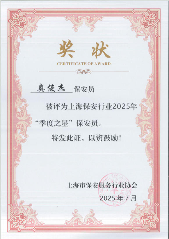近日,上海市保安服務(wù)行業(yè)協(xié)會公布了上海保安行業(yè)2025年第二季度優(yōu)秀保安隊、保安員展示名單,宗保公司1個項目保安隊和3名員工個人獲此殊榮。