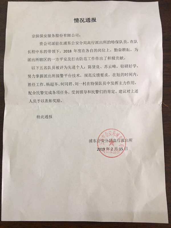高行派出所副所長朱偉青和警長姚志祥出席了會(huì)議,對(duì)2018年工作進(jìn)行了總結(jié),并做出了2019年工作計(jì)劃部署。會(huì)上對(duì)2018年度先進(jìn)保安個(gè)人進(jìn)行表彰并獎(jiǎng)勵(lì)。宗保公司駐高行項(xiàng)目隊(duì)員:陳賢良、蘇云峰、楊超齊、何同君、劉一村由于平時(shí)工作表現(xiàn)出色,受到了表彰及獎(jiǎng)勵(lì)。