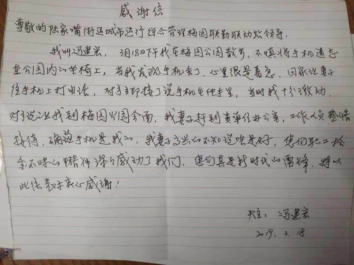 下午15:00時,失主老奶奶至城管中隊,經(jīng)核對無誤,城管隊員將手機(jī)交還給失主,老奶奶再三表示感謝,并要支付酬金給撿到手機(jī)的特保隊員。隊員當(dāng)即表示不用酬謝。